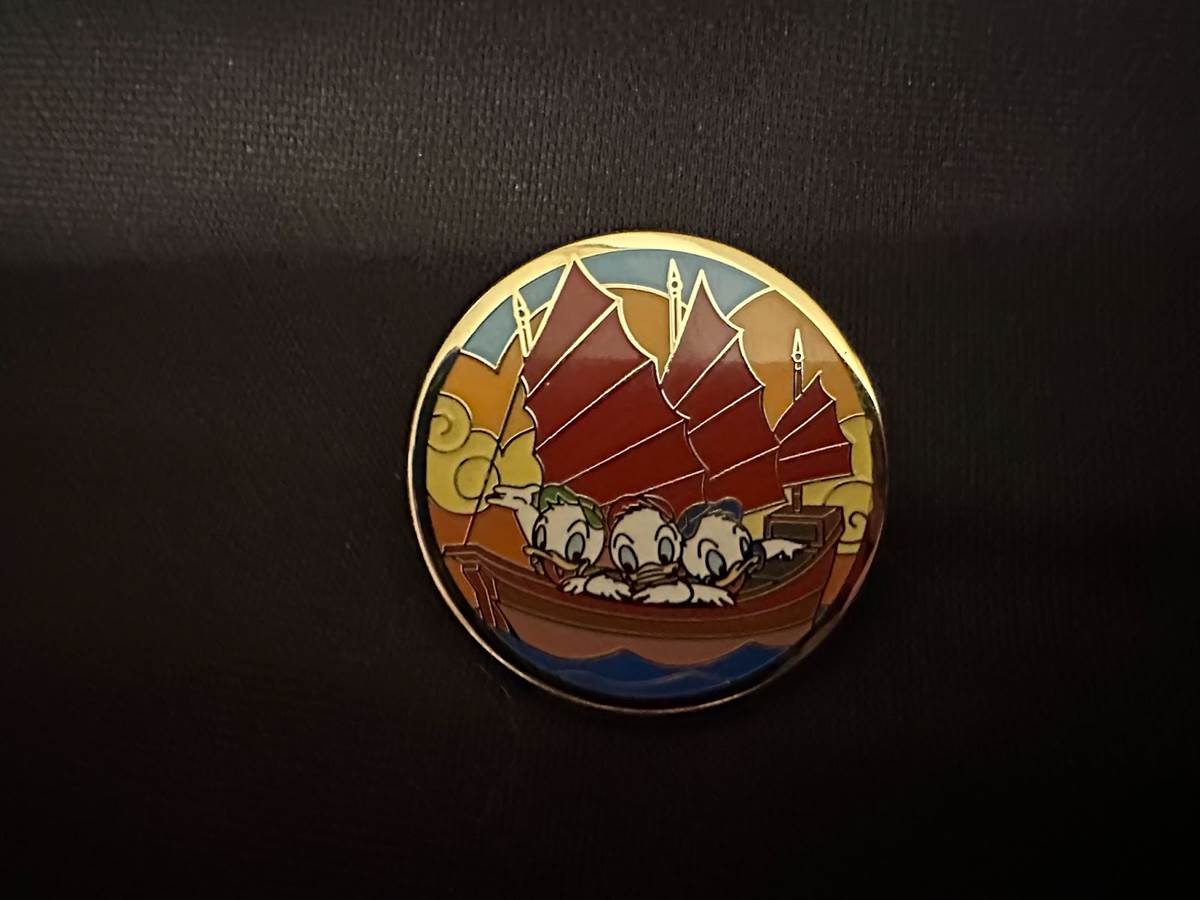 Our pin of the day commemorated our Junk Boat voyage, with Donald Duck’s nephews Huey, Duey, and Louie setting sail in the Hong Kong harbor.