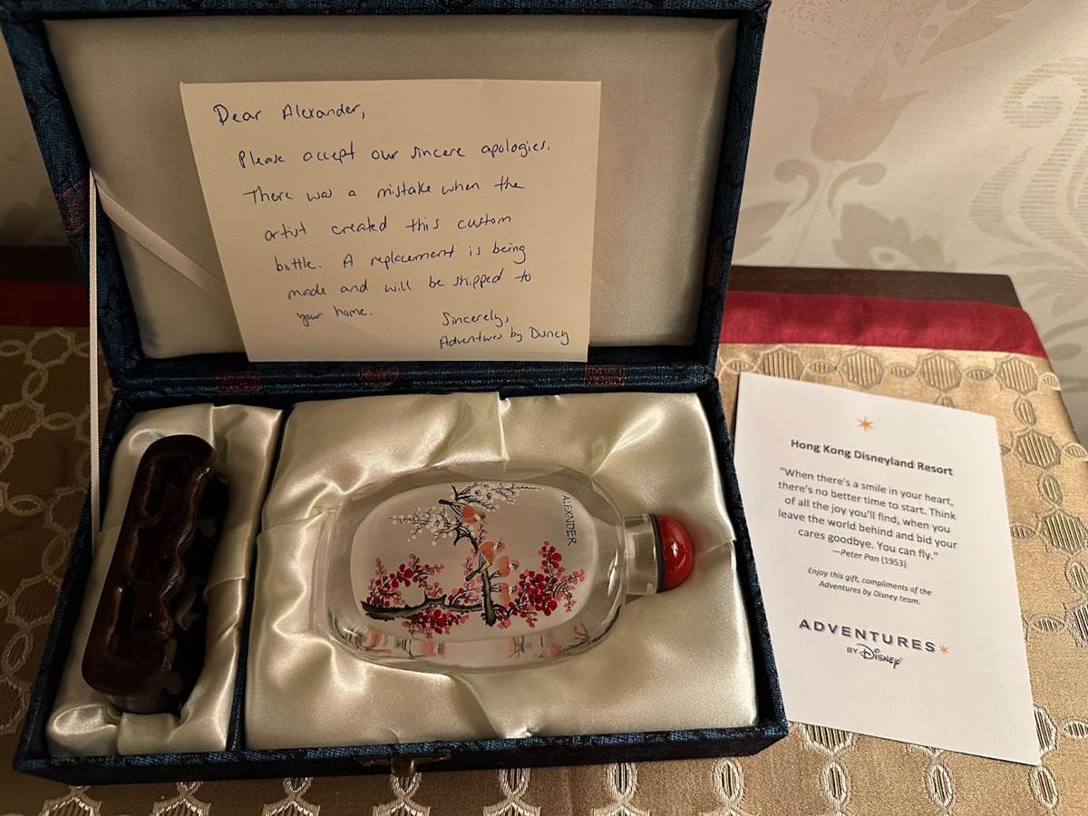 The Adventures by Disney team arranged a unique gift for each Guest - a traditional bottle hand-painted from the inside with our names etched in the glass, plus an elegant base to display it on. Mine had a typo in my name, which I didn’t even notice. But the Adventures by Disney team went the extra mile, including a card with mine that informed of a corrected version that is being created and will be shipped to my home.