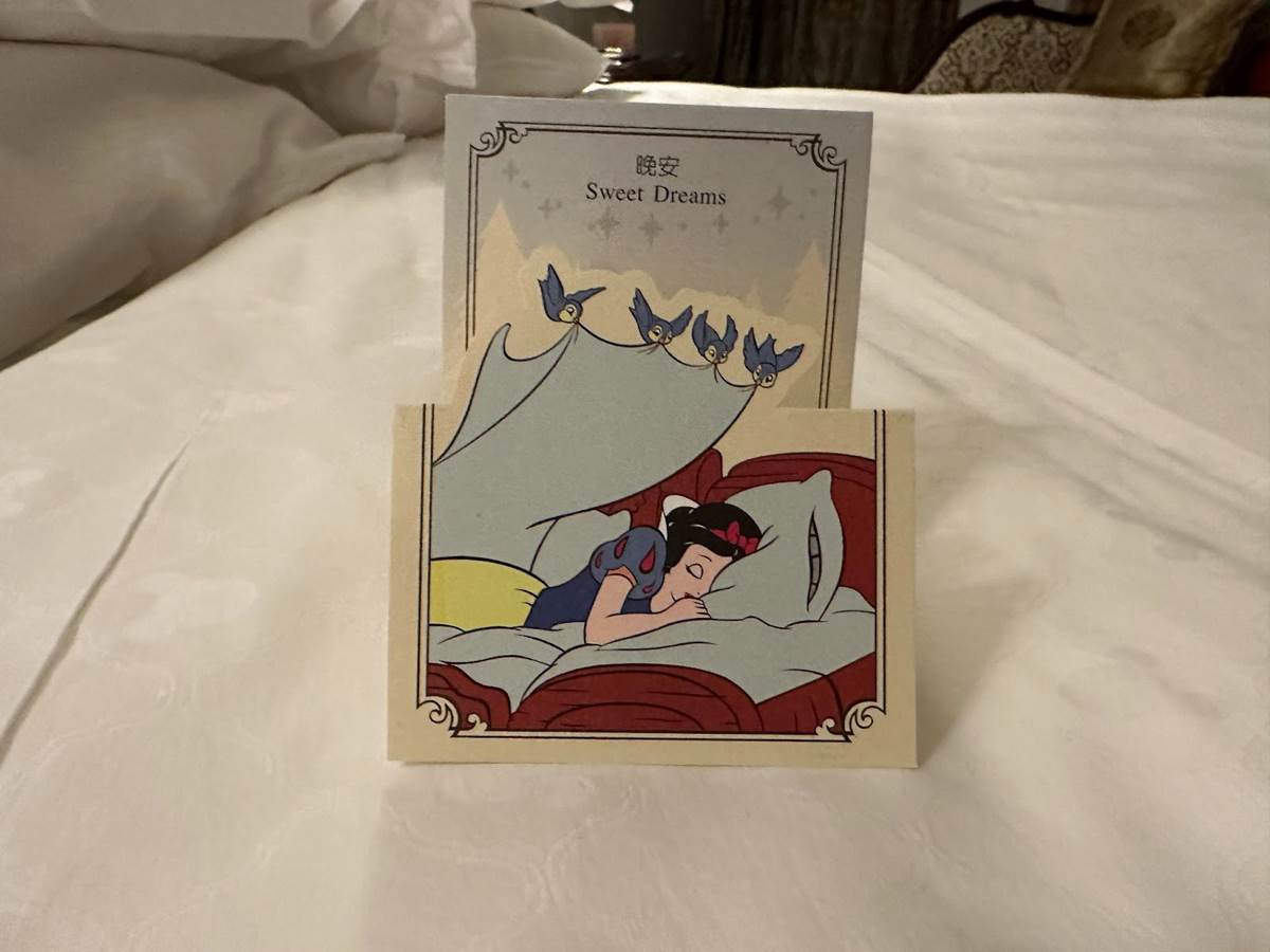 Similarly, our bed had been turned down with this adorable Snow White card wishing us sweet dreams. We definitely felt like we had earned our sleep.