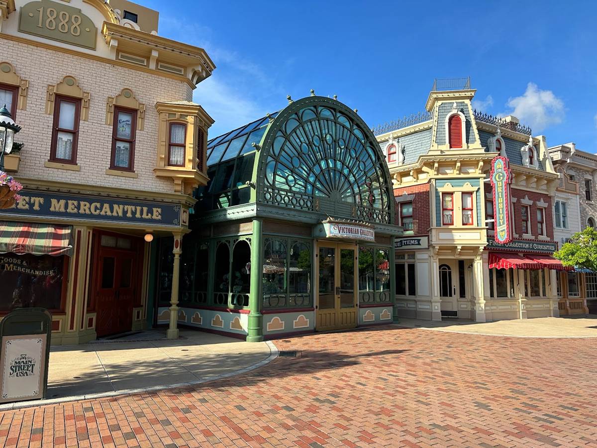 One of the few deviations from Disneyland’s Main Street is the Victorian Collection, a greenhouse space that connects the shops along the Adventureland side of the street. Speaking of the street, in Hong Kong, it’s made of brick, and there aren’t any trolly tracks.