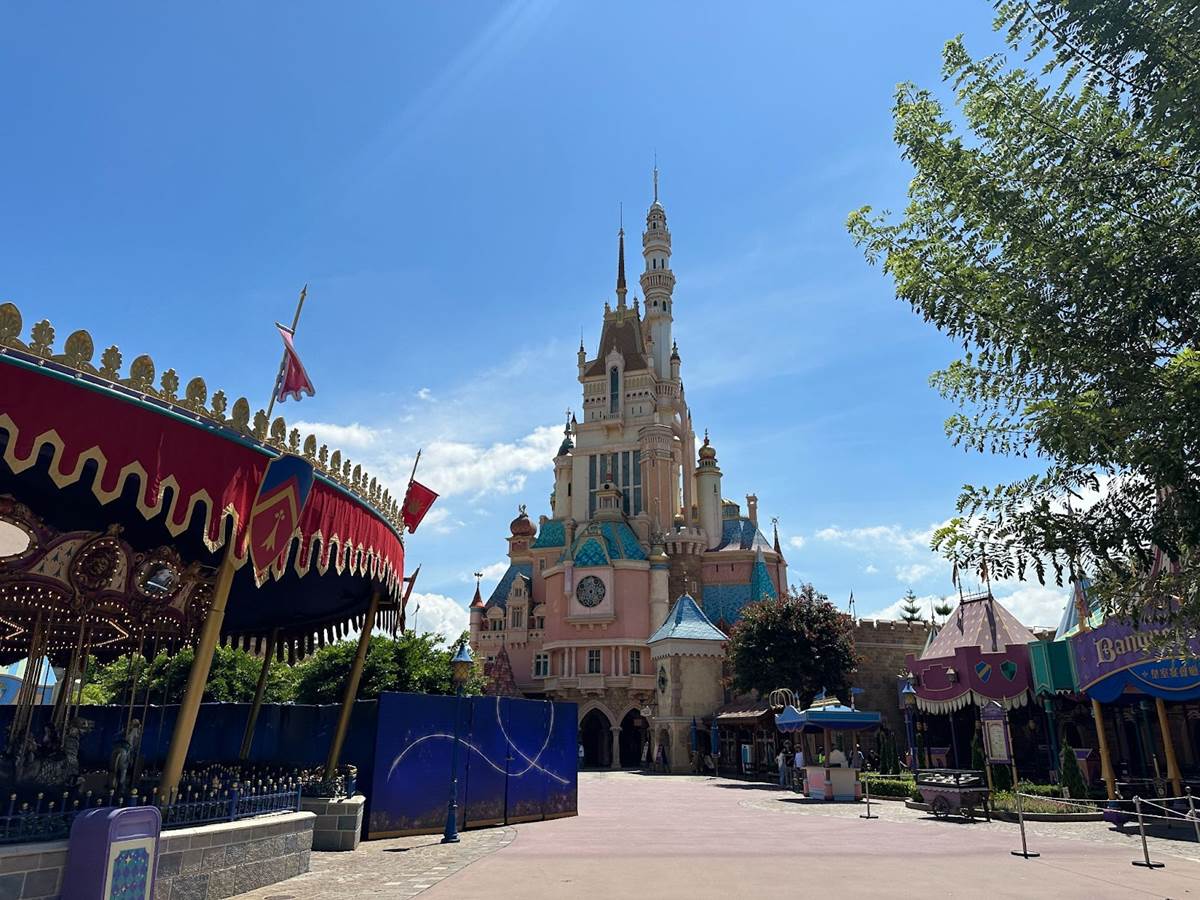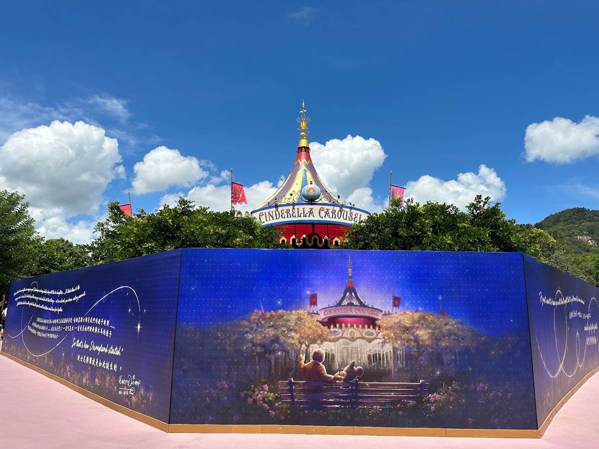 A construction wall between the castle and Cinderella Carousel hides work being done to install Hong Kong Disneyland’s own version of Dreamer’s Point, which places Walt on a park bench next to Mickey Mouse, watching the carousel spin.