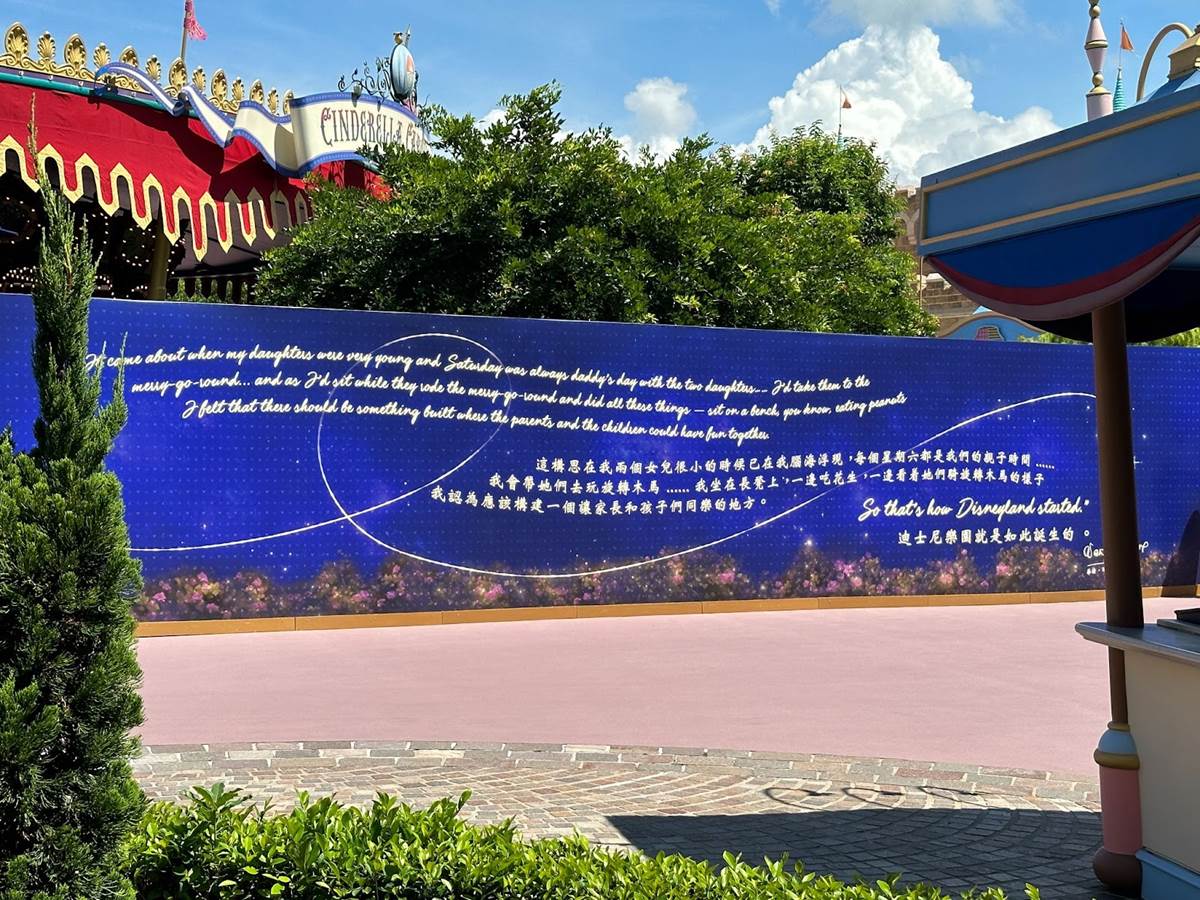 Those who know their Disneyland history will recall that Walt first had the idea for his own theme park while watching his daughters ride a merry-go-round in Griffith’s Park, with his anecdotal quote on the construction walls in both English and Chinese.