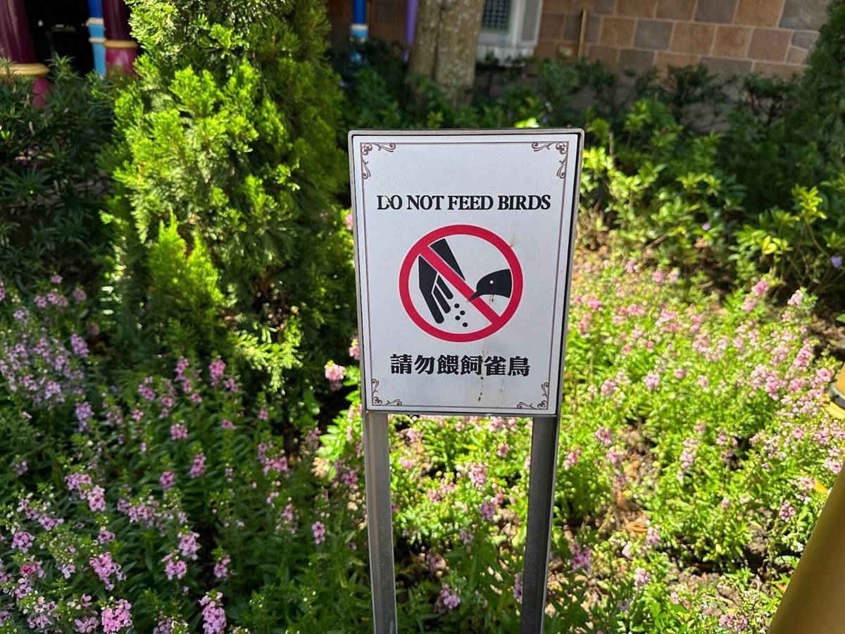 On the theme of Walt Disney, who asked Richard and Robert Sherman to play “Feed the Birds" before he left the office on Friday afternoons, the park asks that guests let our fine feathered friends stick to their natural diet.