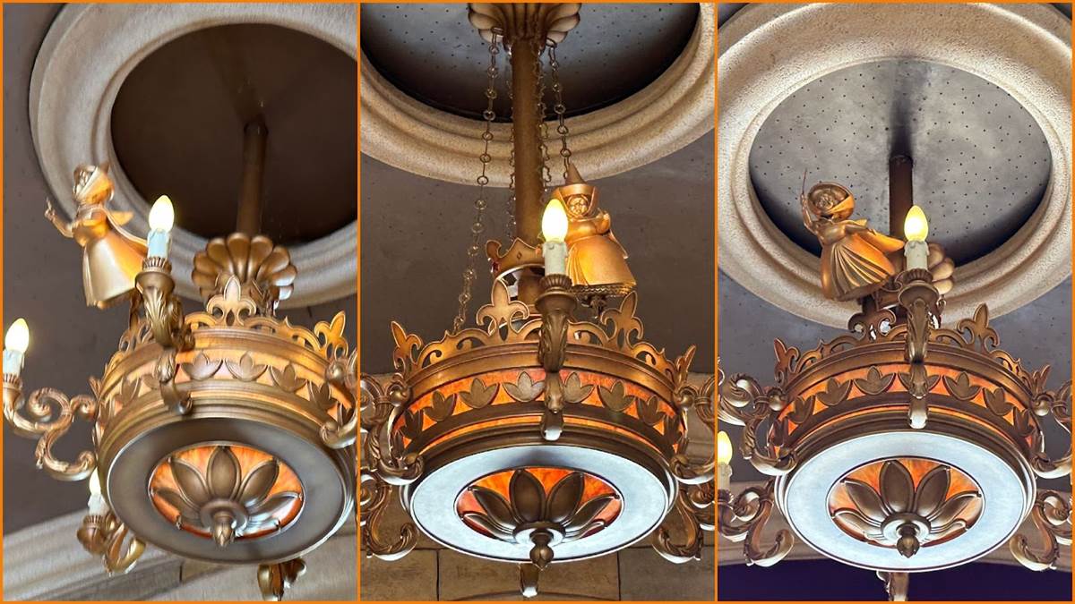 The three fairies from Sleeping Beauty have a place of honor on a trio of chandeliers on the walkway through the center of the castle, which began as a copy of Disneyland’s castle, also attributed to Aurora.