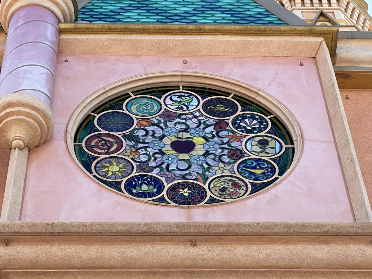On the back of the castle is a stained glass mural featuring icons for each princess. Snow White’s apple is the center, and heading clockwise from the top, each icon goes in chronological order from Cinderella to Moana.