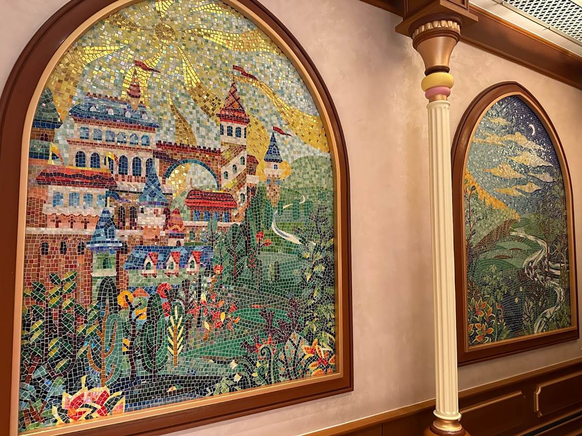 Interior spaces of the castle include a royal meet and greet and a gift shop called Enchanted Treasures. The entrance to the shop features tiled mosaics, a nod to Dorothea Redmond’s artwork inside Cinderella Castle.