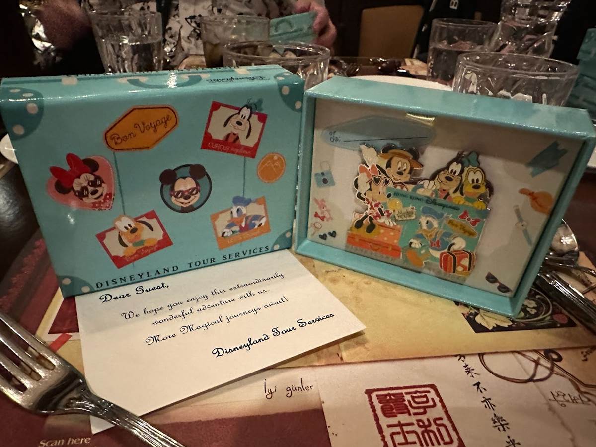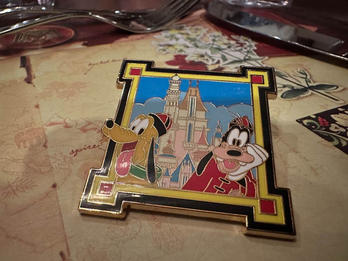 Tim had the honor of bestowing upon us our pin of the day, featuring Goofy and Pluto in their Chinese outfits in front of the Castle of Magical Dreams. Two more special guests joined the dinner, Goofy and Donald in their Mystic Point outfits.