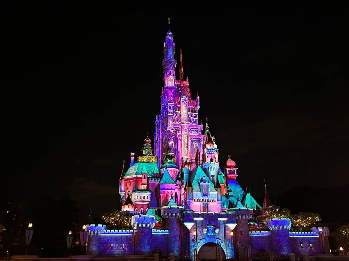 After dinner, we were escorted to a prime viewing location for Momentous, a nighttime spectacular that was designed to make the most of the silhouette of the Castle of Magical Dreams. Leading up to the spectacular, the castle would tell visual stories of the princess characters through projection mapping.