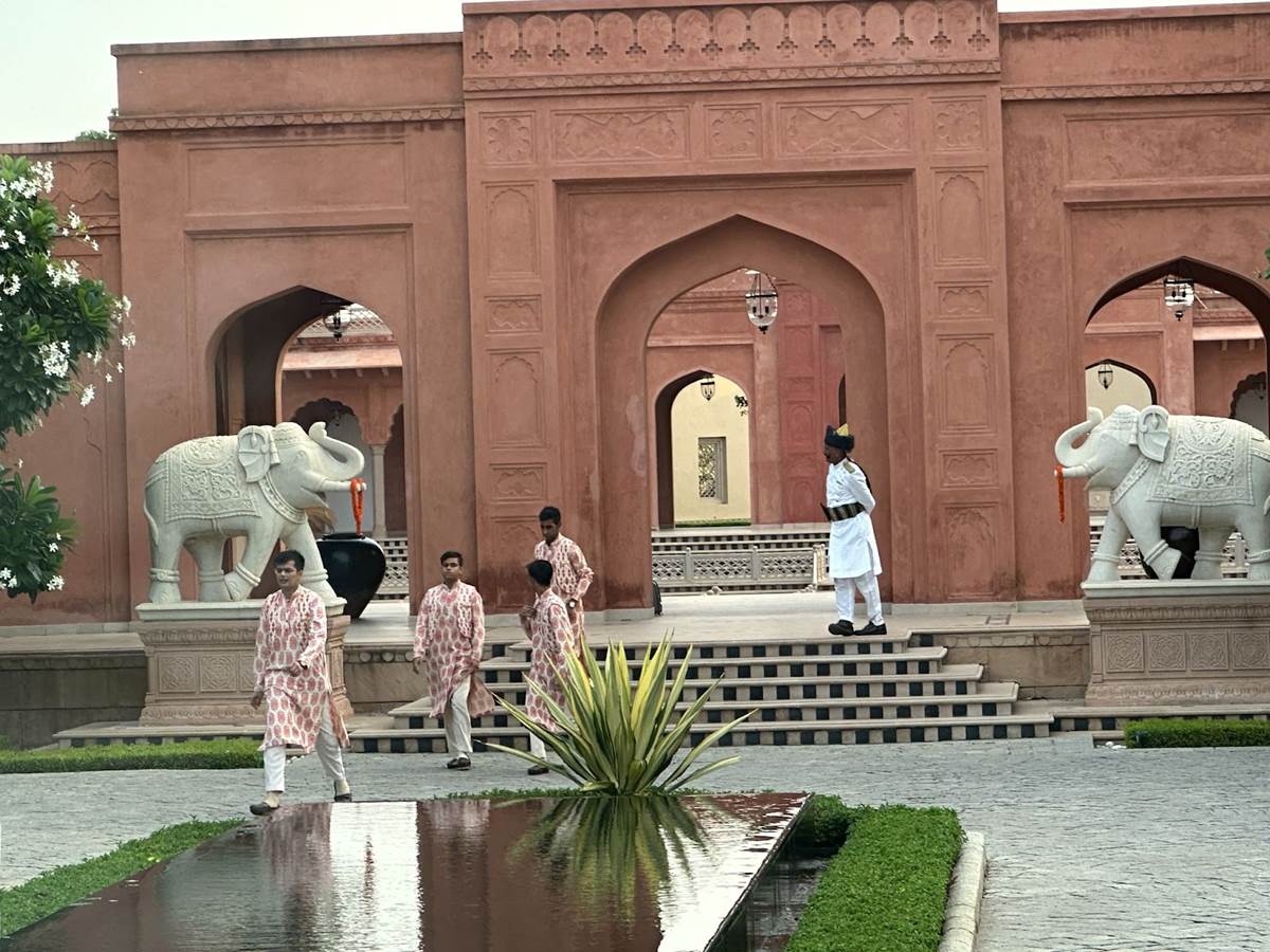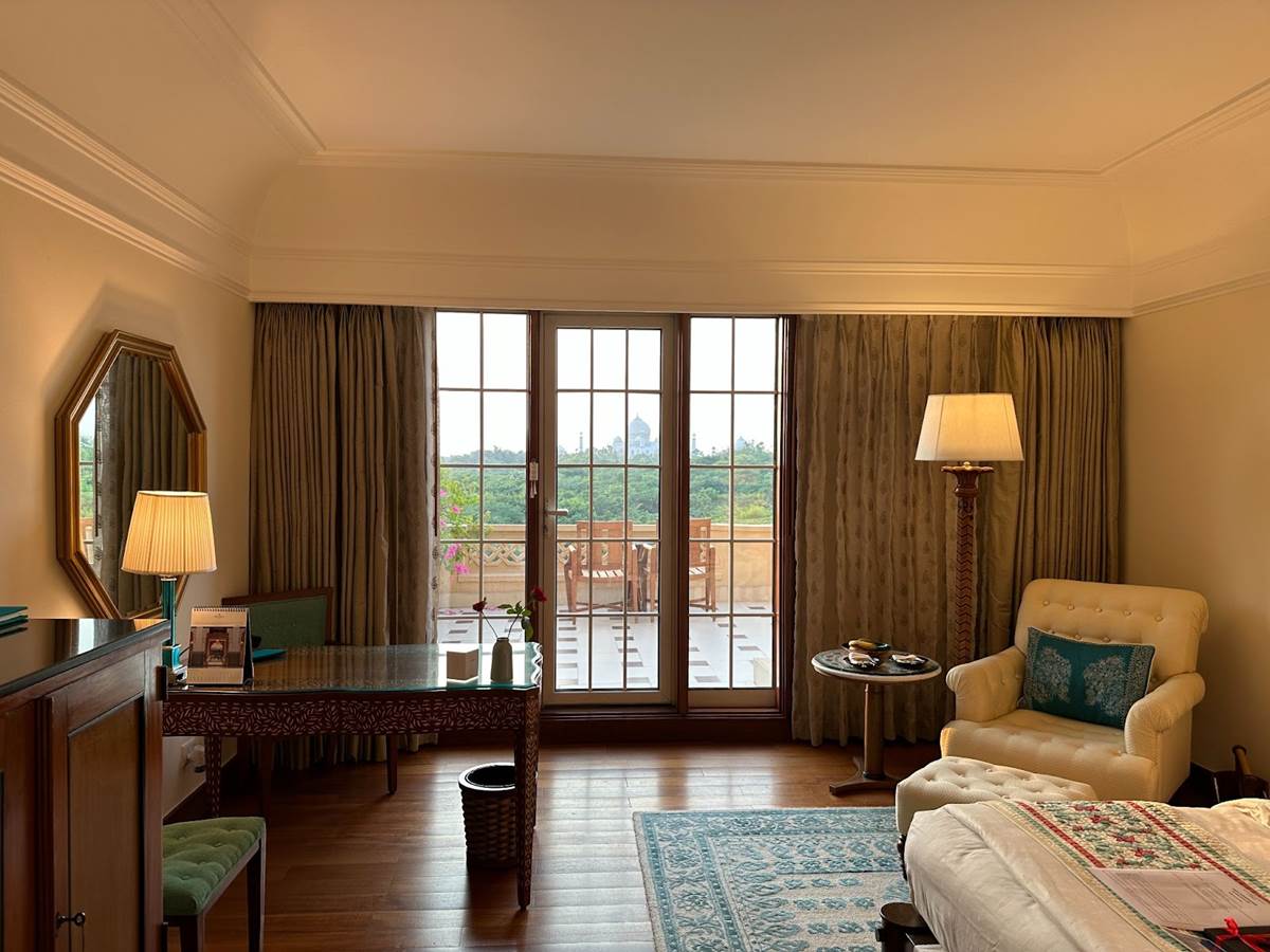 Following a 30-minute bus ride to The Oberoi Amarvilas, we were greeted by the hotel’s staff, who escorted us inside. Inside the lobby, each Guest was adorned with a handmade Jasmine flower necklace and offered refreshments. Checking in was as simple as walking up to a table, giving our name, and being handed our room keys. Each room here comes with butler service, and we were escorted to our rooms. By the way, every room here has a view of the Taj Mahal!