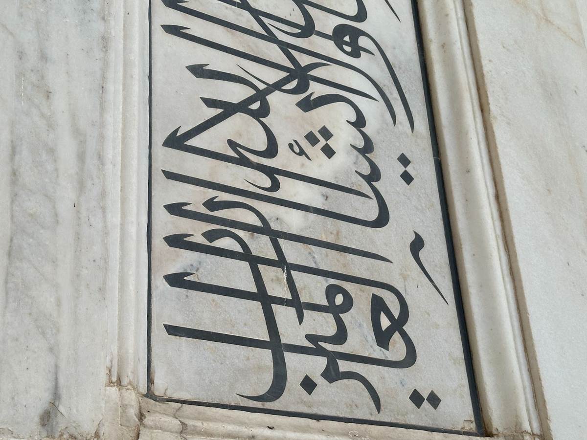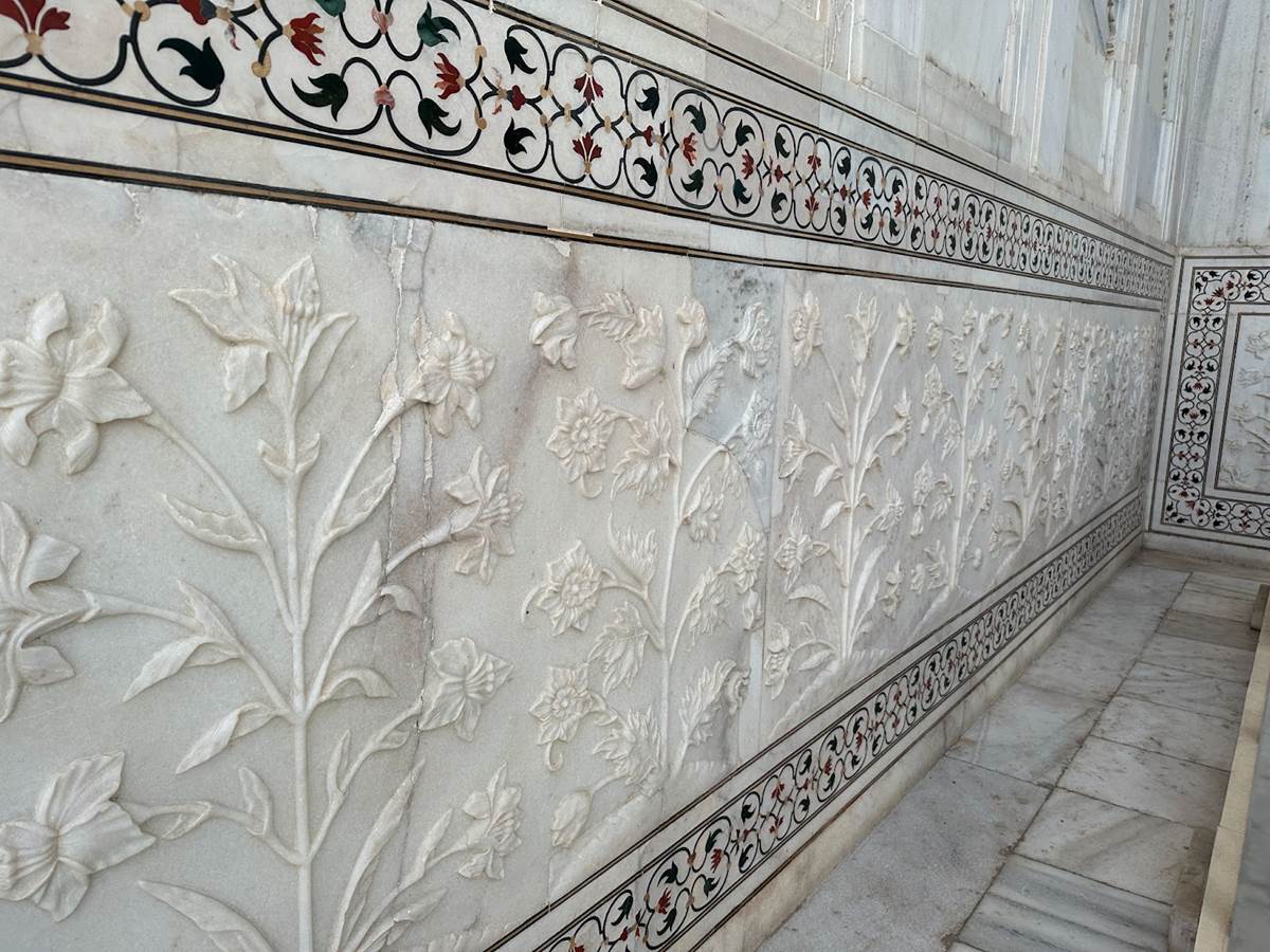 Even the calligraphy texts from the Quaran are hand-cut inlaid stone in marble. Sunil shared that the size of the lettering is actually different sizes at the top and bottom, but the eye tricks you into thinking they’re the same. It turns out that calligrapher Abdul Haq was a forced perspective genius in 1609.