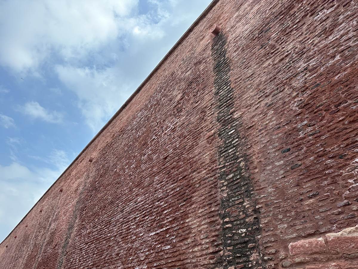 The fort was heavily fortified, with a moat, several walls, angled entrances to prevent an invader from seeing too far inside, and an uphill entrance as a last restart, with gutters from which boiling oil could be poured onto invaders.