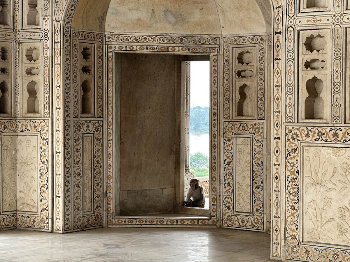 Agra Fort contains several palaces constructed out of easier-to-carve red sandstone. While the walls once glistened white and had beautiful murals, it has not been treated to the same reverence and preservation as the Taj Mahal. Due to looting and vandalism, it’s mostly a shell of its former self. Still, you can imagine yourself standing her in the 1600s when the palace was filled with music and love. The fort is still home to a military base, with some areas off-limits to tourists, although it has a few resident monkeys.