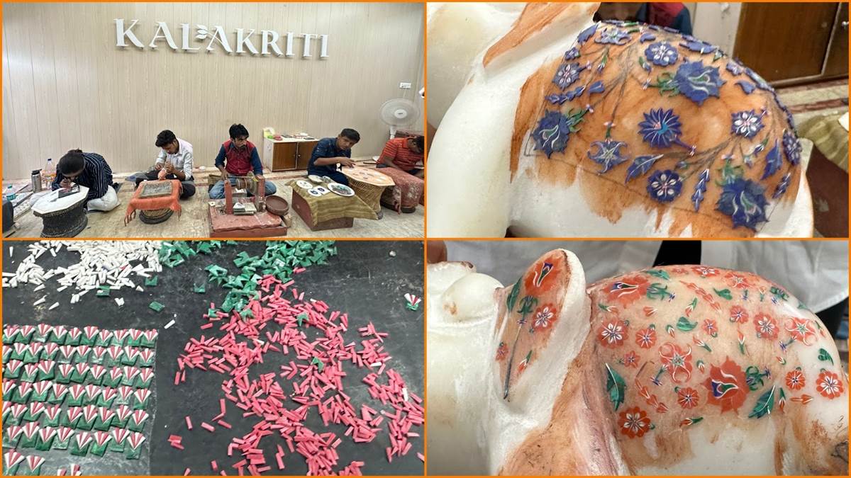 On the way back to the hotel, we were given the option of stopping at Kalakriti Agra where artisans are still carving Makrana marble and inlaying the same types of stones that you can see inside the Taj Mahal. We were treated to a live demonstration of this intricate and painstaking process, with something like a small figure of an elephant taking up to 9 months to complete. Much of the work is done at homes by families that have passed on this craft for generations.