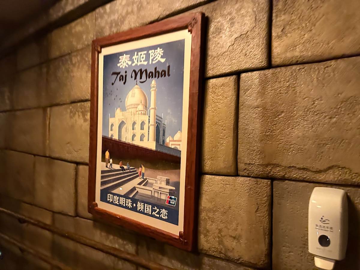 Our stop at the Taj Mahal was inspired by the destination’s inclusion in the attraction Soarin’ Around the World (aka Soaring: Fantastic Flight at Tokyo DisneySea and Soaring Over the Horizon at Shanghai Disneyland). However, the version you see in the attraction is computer generated as it is illegal to fly over the Taj Mahal. We found this poster in the exit of Soaring Over the Horizon.