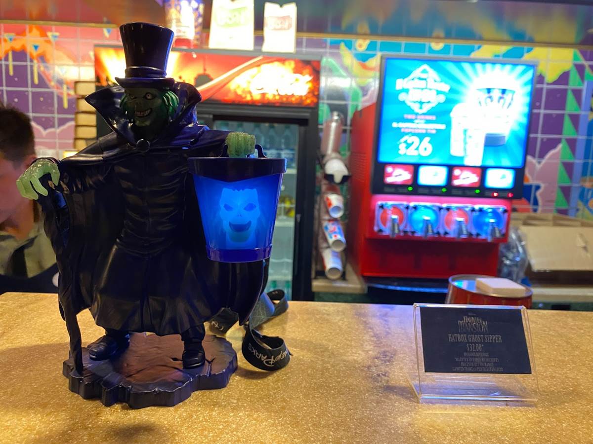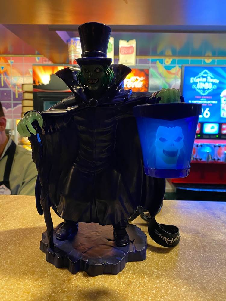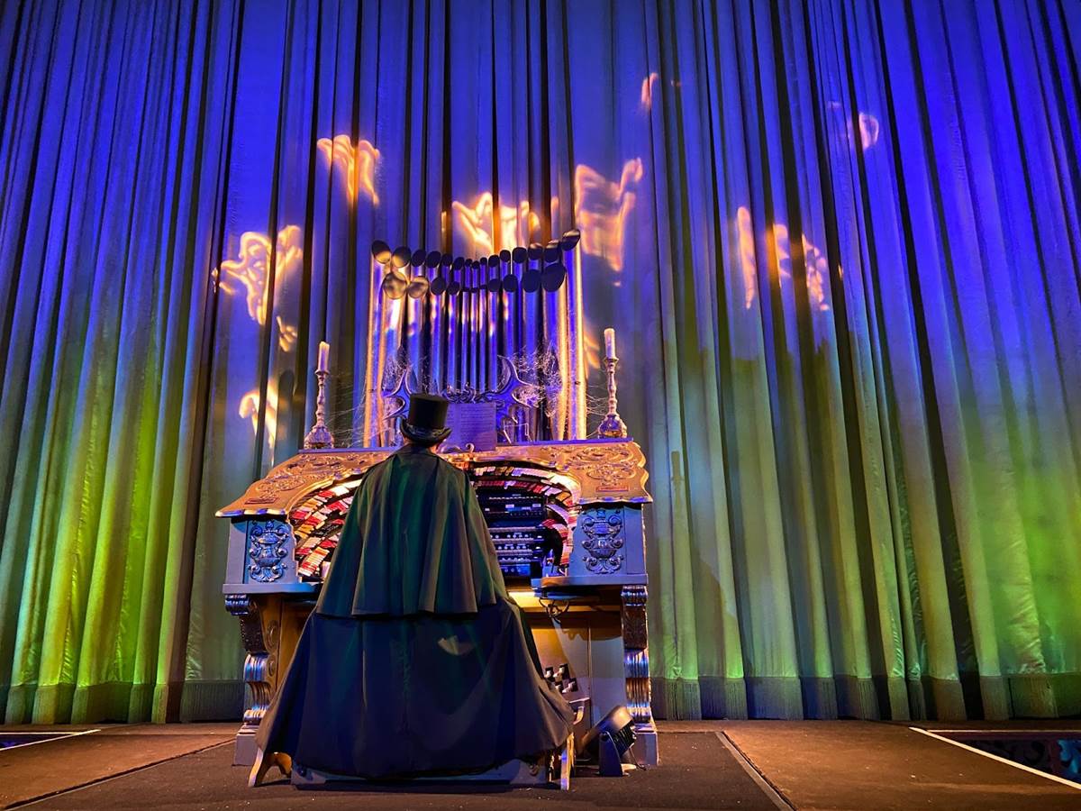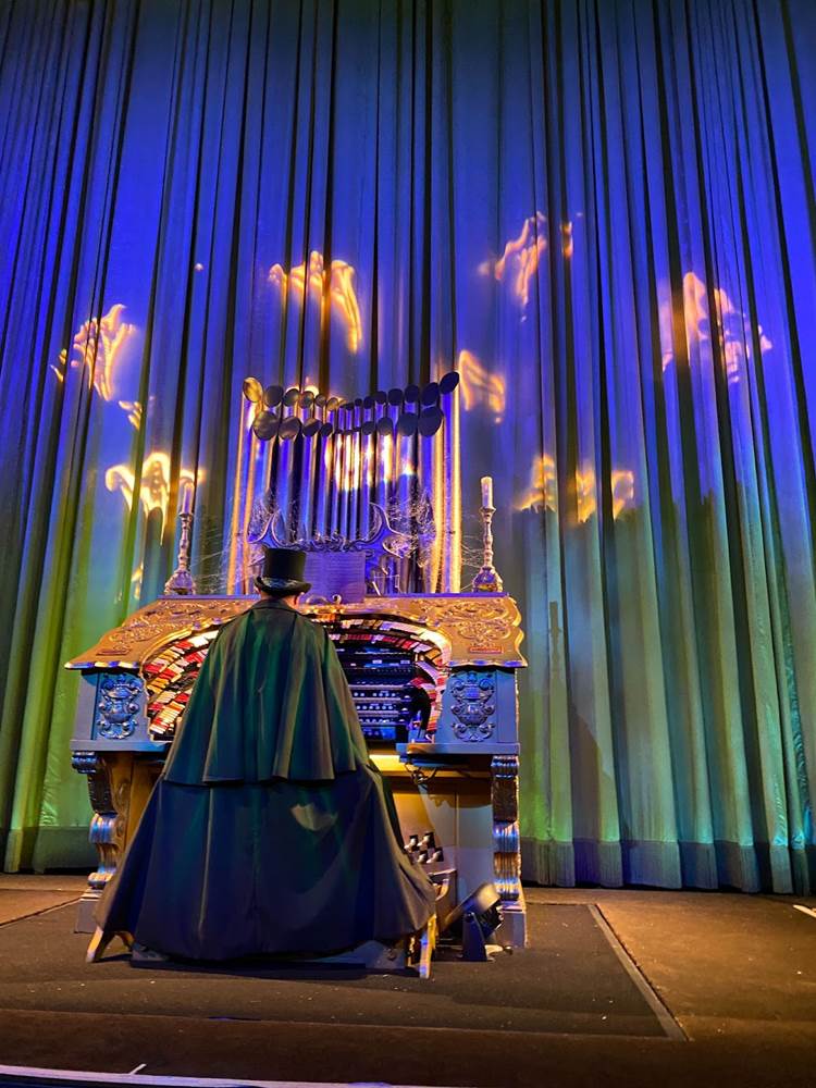 In the embedded video below, you can see how El Capitan Theatre’s fan-favorite pipe organist is also decked out for Haunted Mansion in a creepy cloak, as the decorations inside the auditorium and the theater’s lobby pay tribute to the classic attraction at Disneyland and Walt Disney World. There’s also a very cool Hatbox Ghost sipper that will not-so-coincidentally be available at Disney Parks beginning tomorrow to coincide with the movie’s release.