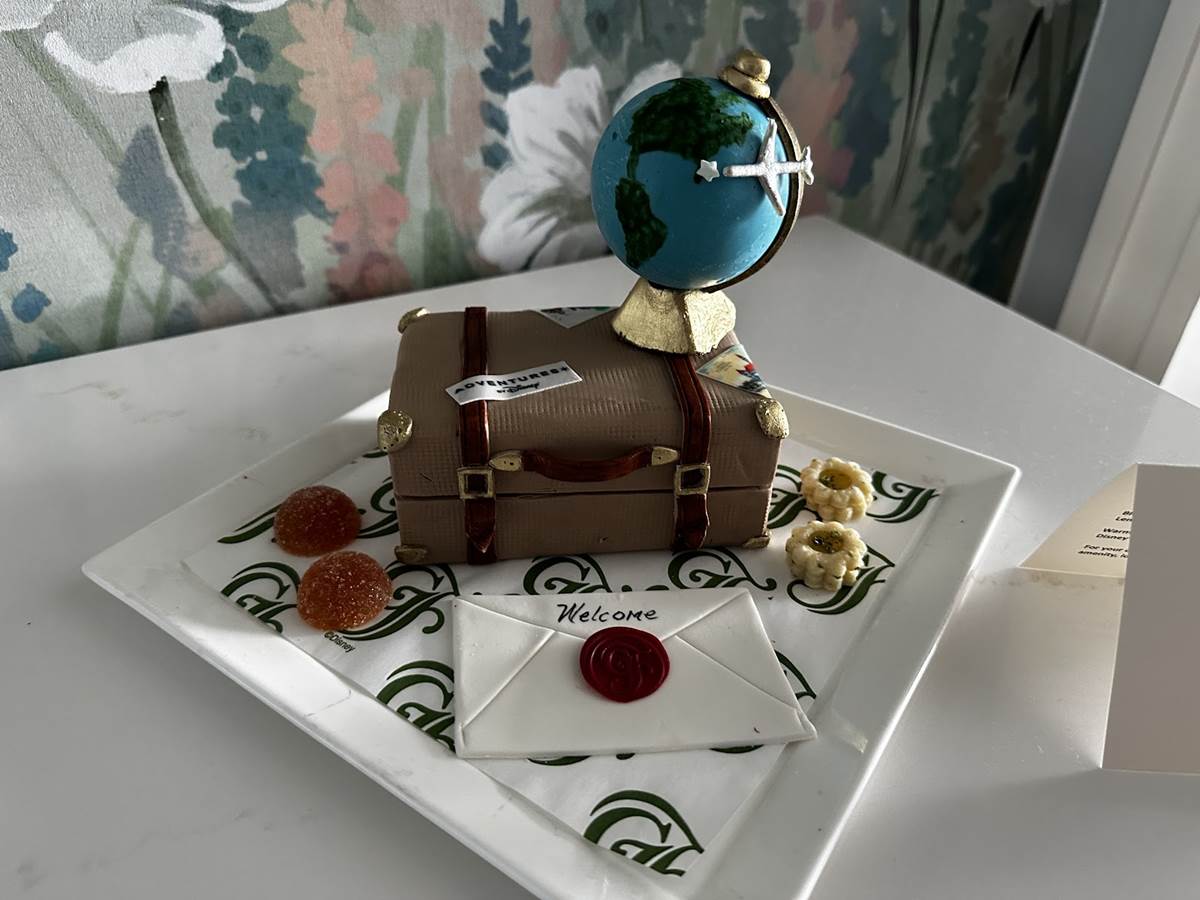 Gifts included a bag of snacks, umbrellas, a lithograph for Walt Disney Animation Studios’ Wish, the cel that was being prepared for us at the Ink & Paint Department during our studio tour at the beginning of the trip, plus a customized edible sculpture.