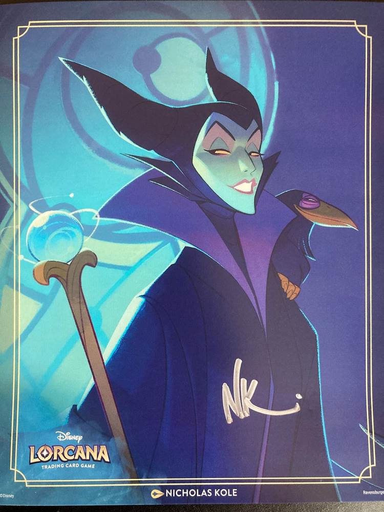 For most parties, you’d probably expect to get a gift bag as you exit — but that wasn’t the case here. Instead, we were given various Disney Lorcana items as we arrived. Furthermore, rather than wait until we were back in our hotel rooms to open these gifts, we were encouraged to open up our decks and trade with fellow attendees. As a reward for trading with others, those who completed their checklist of six cards to collect received a bonus prize: a print of Malenficent done by artist Nicholas Kole (who I had the pleasure of interviewing earlier in the day and hanging out with during this event).