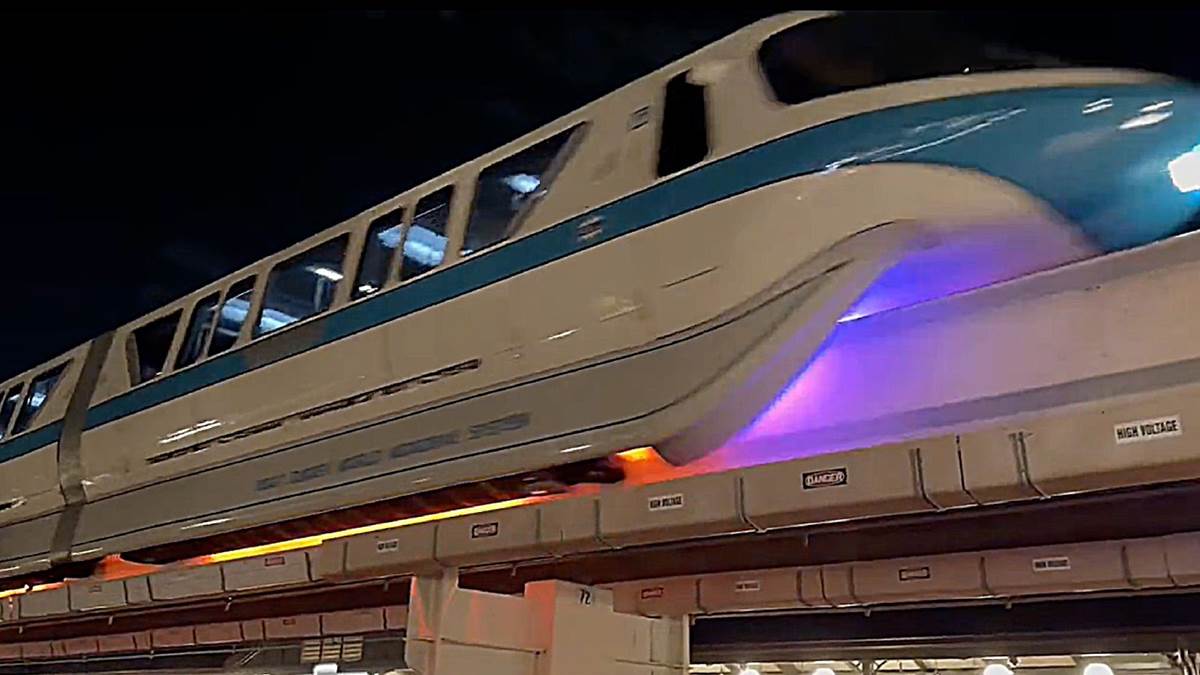 - The lights underneath the trains, added for the resort’s 50th anniversary, typically match the colored stripe of the monorail.