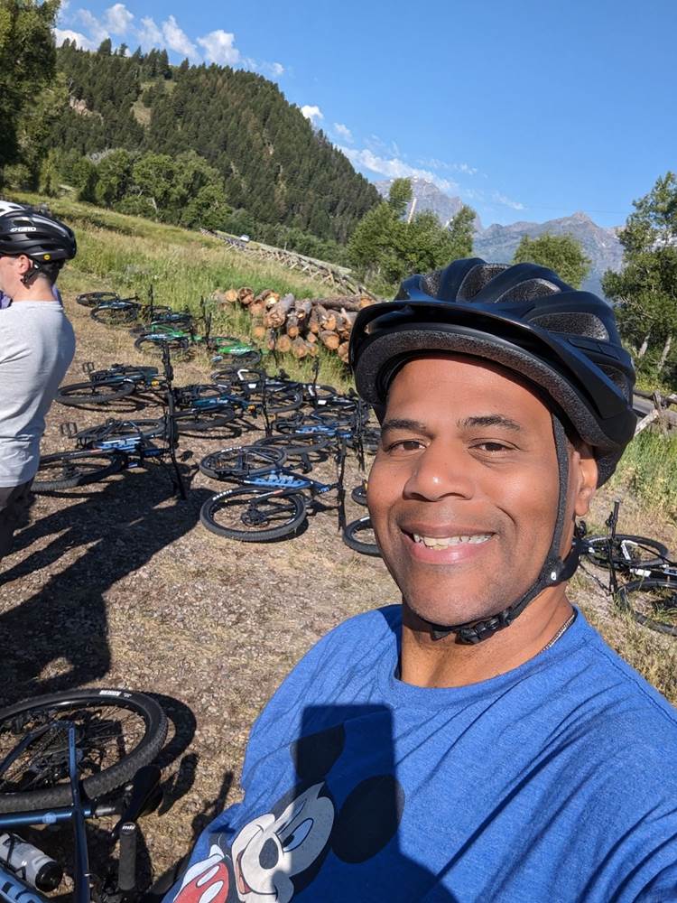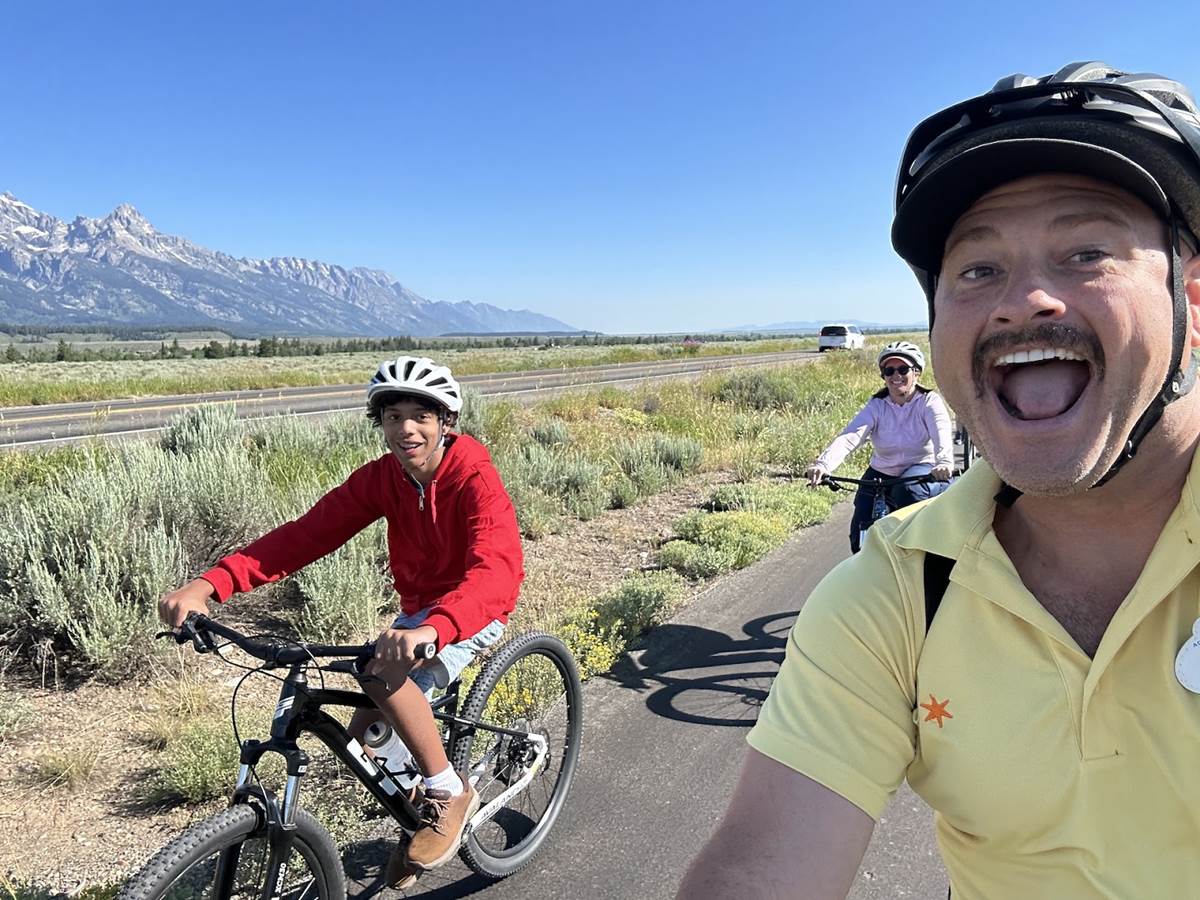 The first bus ride was pretty short, less than a half hour to the point where we’d take a bike ride near the beautiful Grand Tetons. Our guides had previously asked each of our heights so when we arrived, we received a helmet and lined up in height order so the bike guides could quickly give each of us the right sized bike.