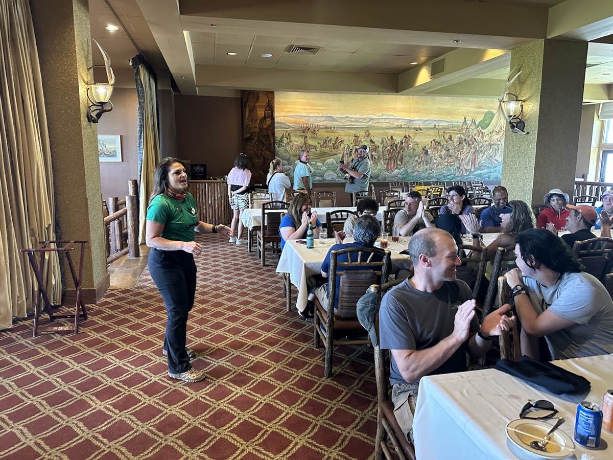 Day 3 began bright and early. We had to have our luggage in front of our room by 7 a.m., and while it would travel on the same bus as us, we wouldn’t see it again until it was delivered to our room at the OId Faithful Inn. Breakfast this morning was a group breakfast in a conference room featuring typical breakfast fare and Mickey pancakes.