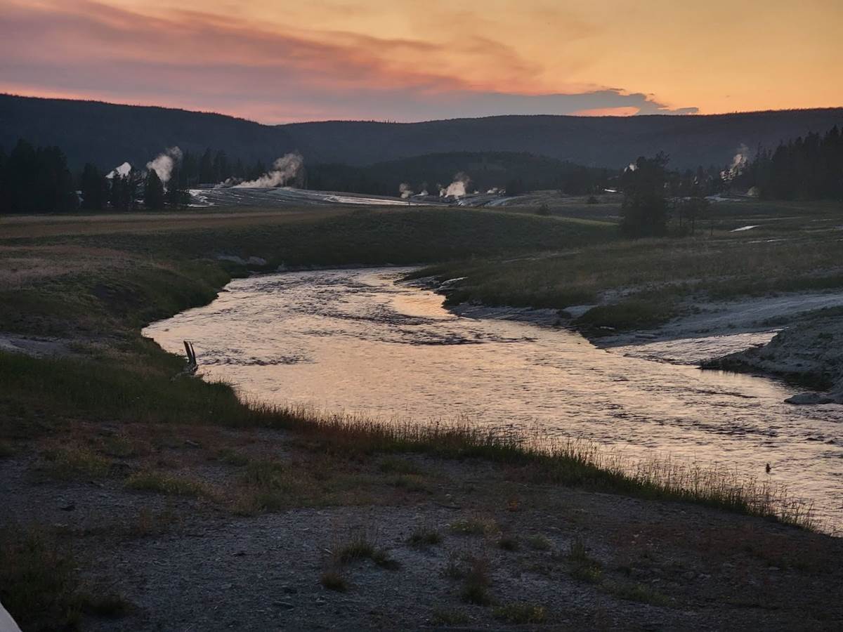 Before turning in we decided to take a walk around the area. Old Faithful isn’t the only geyser around. Looking out over the area, it is surreal the way steam seems to emanate from everywhere. A reminder that we were, indeed, sitting atop a giant volcano. The bugs were evil right around the dusk, but it was worth enduring them to explore the area at dusk and get some great pictures.