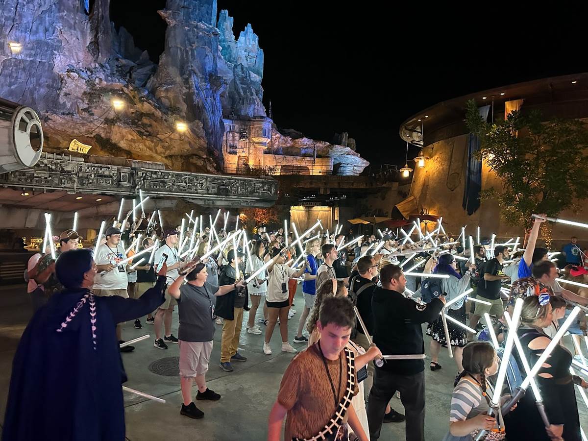 Since everyone now had lightsabers, after the screening, the group was taken back to Batuu for an iconic group photo in front of the Millennium Falcon. Each Guest received a download link to access the photo. It sounds almost as good as Life Day!