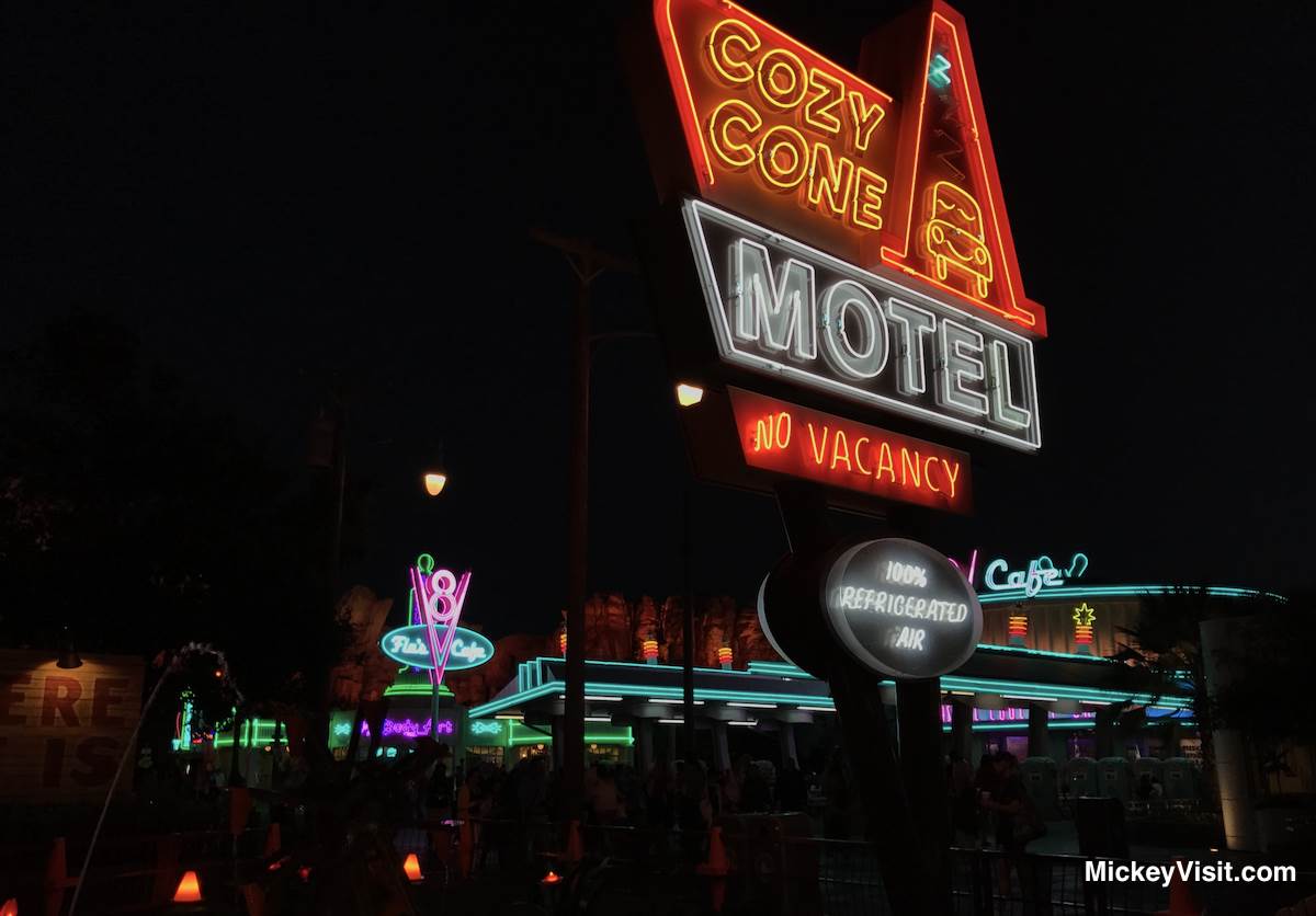 On your way to the ride, the entirety of Cars Land is lit up with stunning neon lights and signs. The beauty of the Ornament Valley scene at nighttime is unparalleled, with the beauty of the bridge and waterfall all lit up before you venture into the dark ride portion of the attraction. During the racing portion of the ride, the rock formations surrounding the track are also enhanced with lighting effects, and it’s quite a sight to glimpse the neon Cars Land lights as you go zooming across the track. You’ll zoom right by Flo’s V8 cafe which is one of our top best Disneyland restaurants.