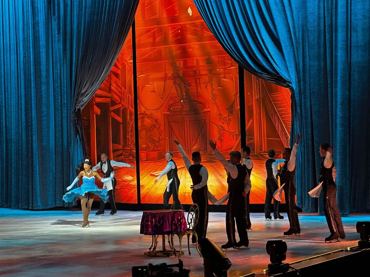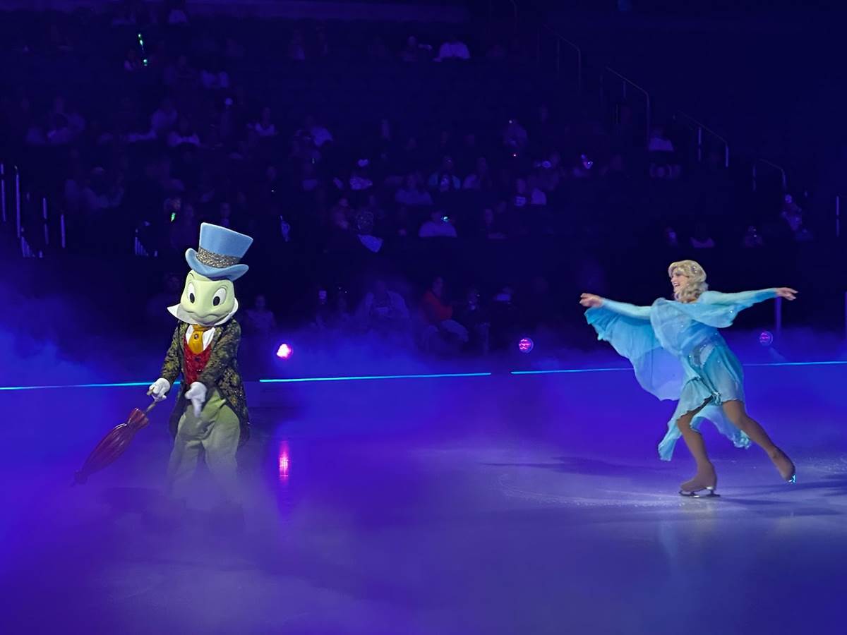 The show kicks off with Disney’s anthem, “When You Wish Upon a Star" from Pinocchio. Jiminy Cricket is joined on the ice by the Blue Fairy, who flies in on a wishing star before transitioning to a skating routine. The song’s arrangement further connects the show to the Disney100 celebration, using instrumentations featured in the Sara Bareilles anniversary version of the song. That then segued into “It’s Wonderous," which underscores Disneyland’s anniversary fireworks spectacular, Wondrous Journeys.