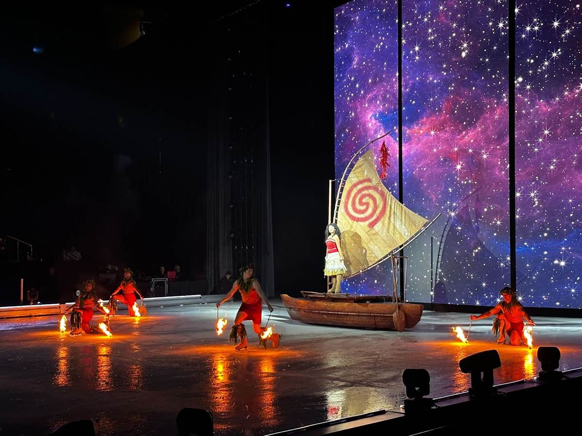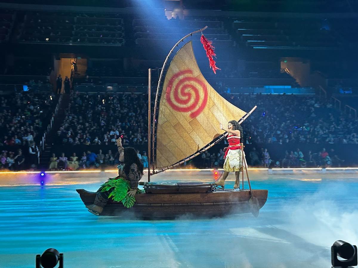 While all of the characters thus far have wished upon a star, Moana is the only one who has also used them for wayfinding. Skaters usher her arrival through fire, and Moana sails onto the ice aboard her ship, gliding off to perform “How Far I’ll Go."