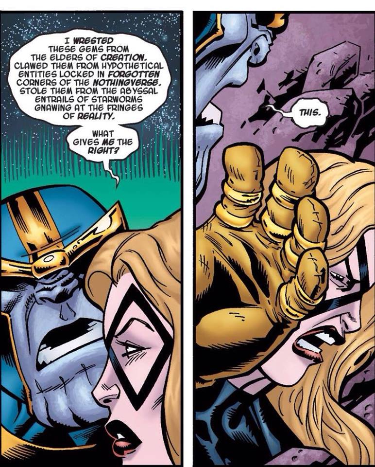 Let’s revisit what happened in Avengers: Infinity War. Thanos, thanks to the power of the Infinity Gauntlet, snapped his fingers and half of all life in the universe vanished. Thanos literally has full control of time, space, mind, soul, power and reality. Captain Marvel is strong. She’s not that strong. In fact, Captain Marvel has struggled with Thanos in the comics.