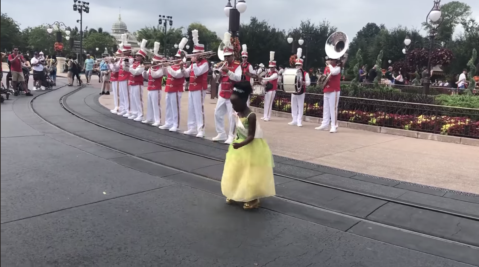 Following her Princess Tiana makeover at the Bibbidi Bobbidi Boutique, a young guest visiting Magic Kingdom was having quite a moment dancing to the music of the Main Street Philharmonic.