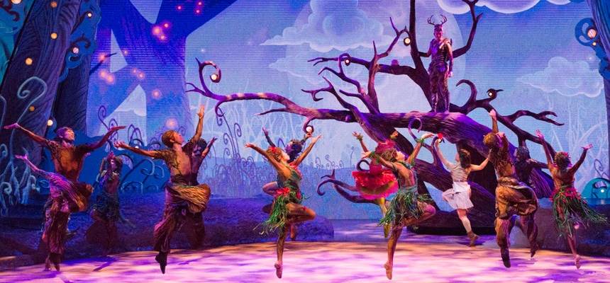 After the song ended, Mei suddenly got a little scared as the forest went dark. Out of nowhere, a waterfall appeared and the floor of the stage started to transform and appear like a river. As music came back, Mei and the deer saw two water spirits emerge, with both performers on a wire. As the performers started dancing, the floor of the stage slowly started lifting up until it was completely vertical with the water spirits basically dancing up and down the wall. It was so completely entrancing because I had never seen anything like it before.