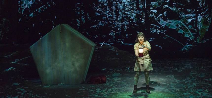Our story begins with some kids who are on some kind of camping or school trip with an instructor. (The show being in Japanese, I’m going to try and give my best interpretation of events here.) One girl, Mei, shows up a bit late and almost immediately gets lost as she follows a (projection mapped) eagle. Resigned to her fate, Mei sets up her tent for the night while singing a song to build her courage up. As she sings, her tent expands and she pops out to see a magical flutter of light appear that she begins to learn that she can control.