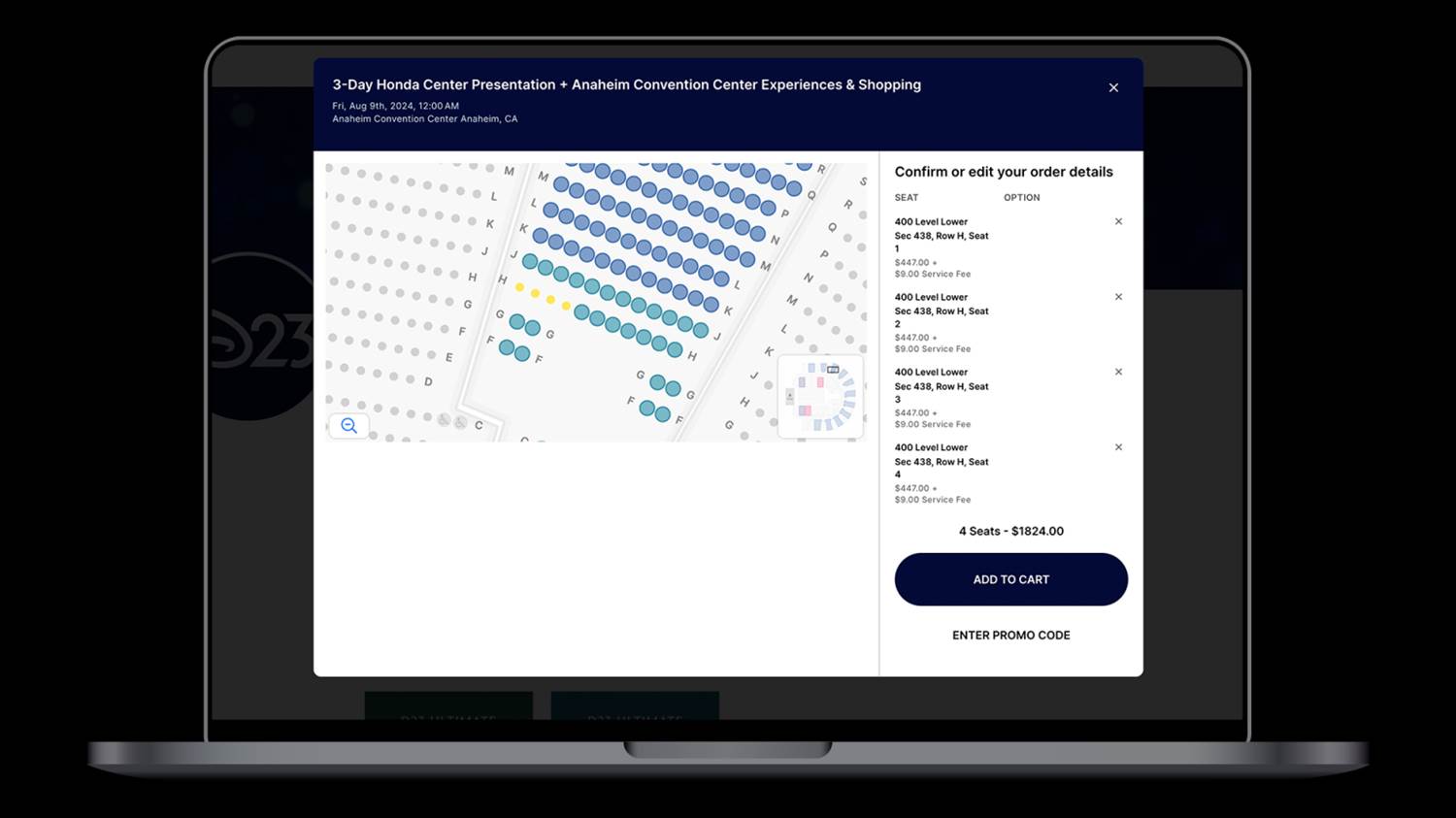 - D23 Ultimate Preferred Fan Pass 3-Day Ticket (exclusive to D23 Gold Members) includes a 3-day floor seat for evening shows at the Honda Center (same seat each night) and 3-day access to all experiences at the Anaheim Convention Center. Seats available in: Sections 101, 102, 103, 104, 105, 106, 107, 108, 109, 110, 111, 112