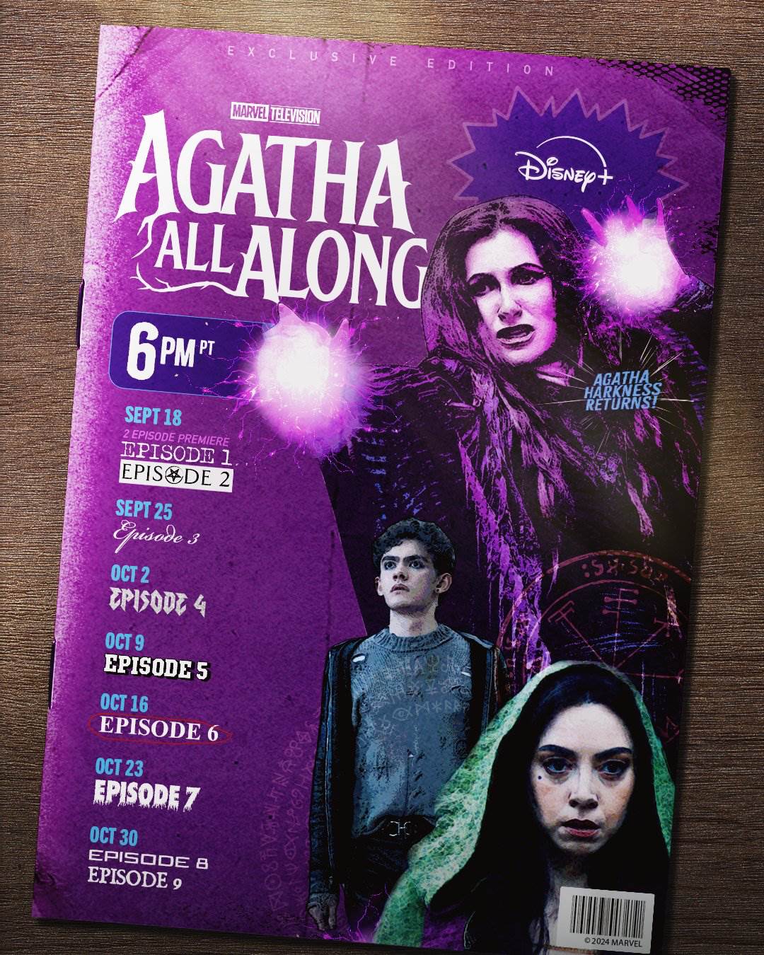 - Disney+ shared this fun image on their X account today, revealing the episode release schedule for Marvel Television’s latest series, Agatha All Along.