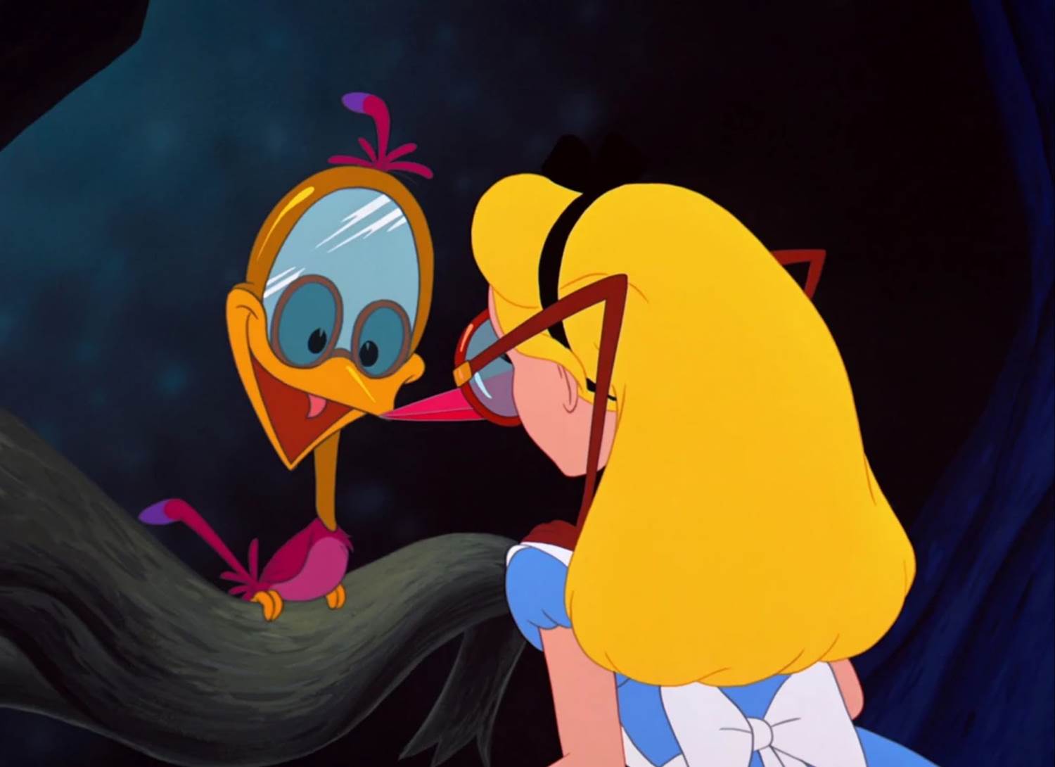 - Mirror Bird - She is looking out for everyone. How often do you get stuck in public with a hair astray or food in your teeth without easy access? The mirror bird is a girl’s girl. She’s always looking out. When Alice comes across the mirror bird in the wood, the bird chuckles and delights in the absolute serve that is Alice wearing alive glasses. That smile with the eyes line up with the bird’s? An utter delight.