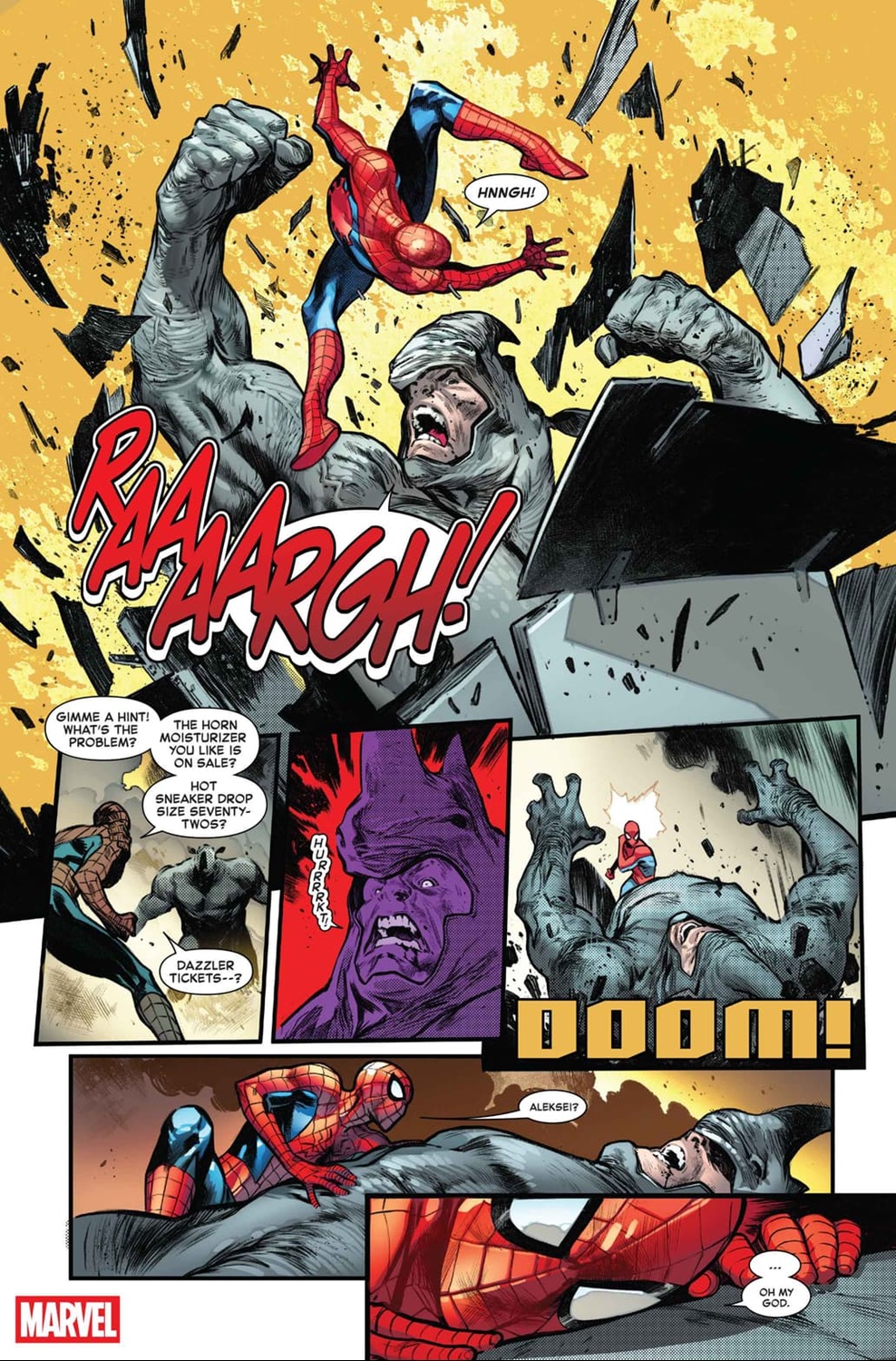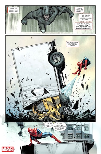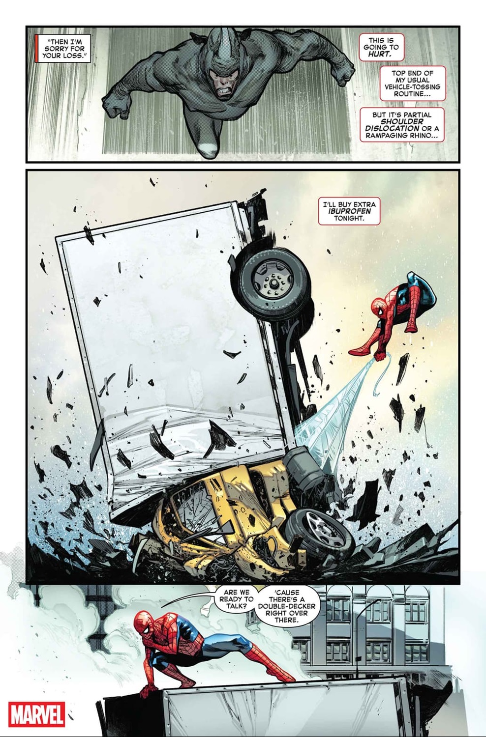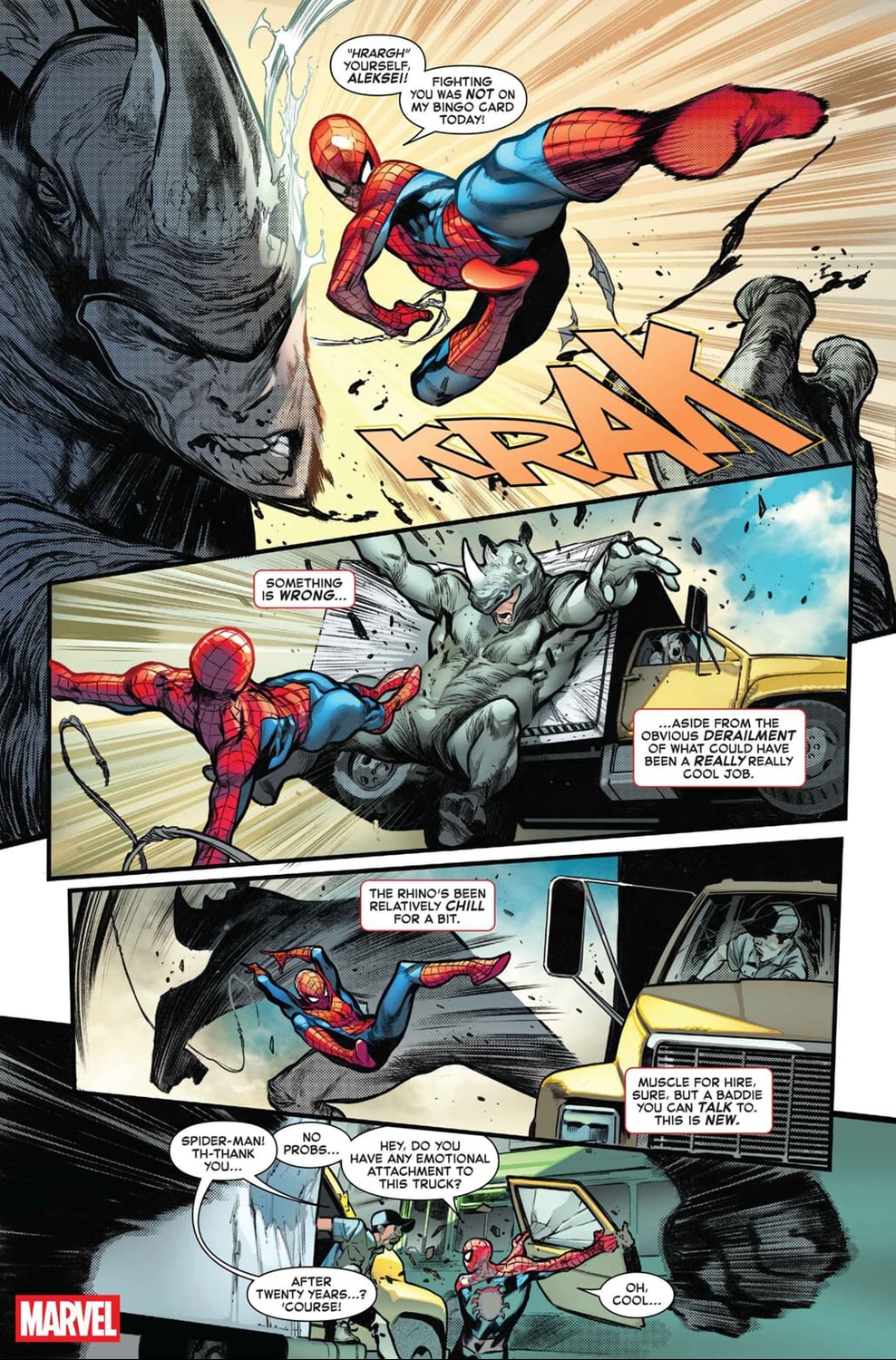 - Throughout the preview pages, readers will be invited into the first entry of Spider-Man’s new story. Kicking off with a faceoff against longtime foe Rhino, Spider-Man notices there is something different about Rhino’s latest rampage. When the battle meets a tragic end, Peter will discover that someone has been making his foes meaner, more aggressive, and more destructive.