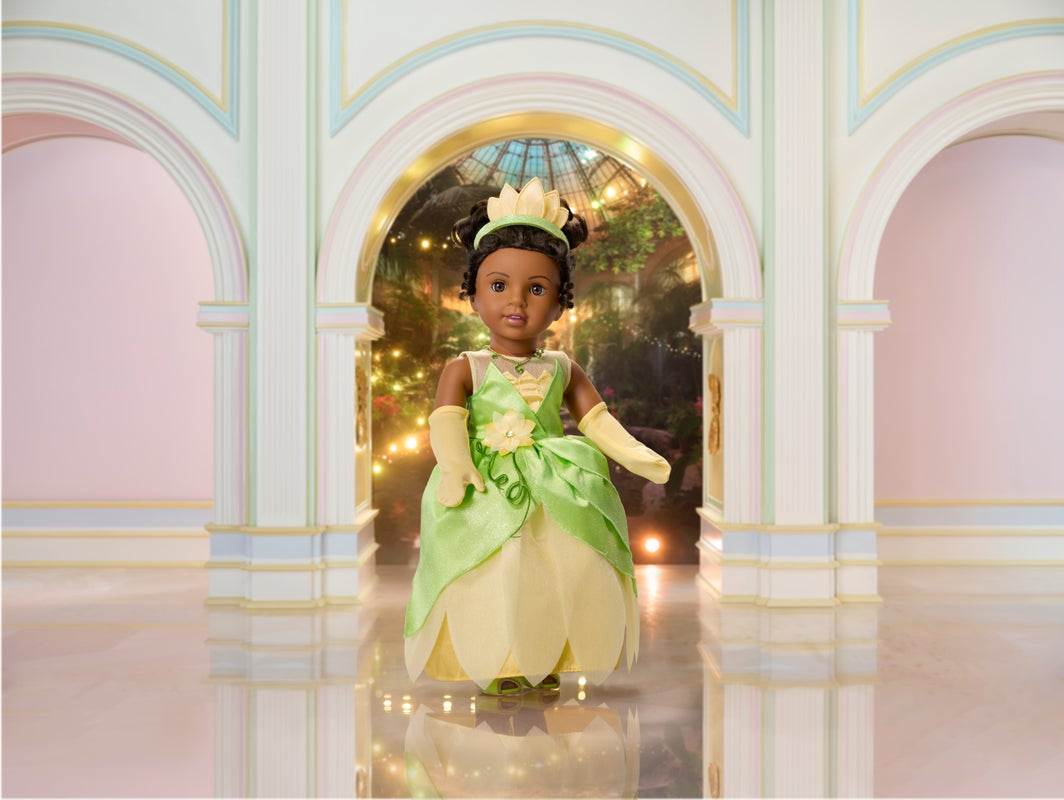 - American Girl Disney Princess Tiana Doll has brown eyes and curly black hair styled in a high bun with face-framing tendrils and arrives in her signature green-and-yellow dress.