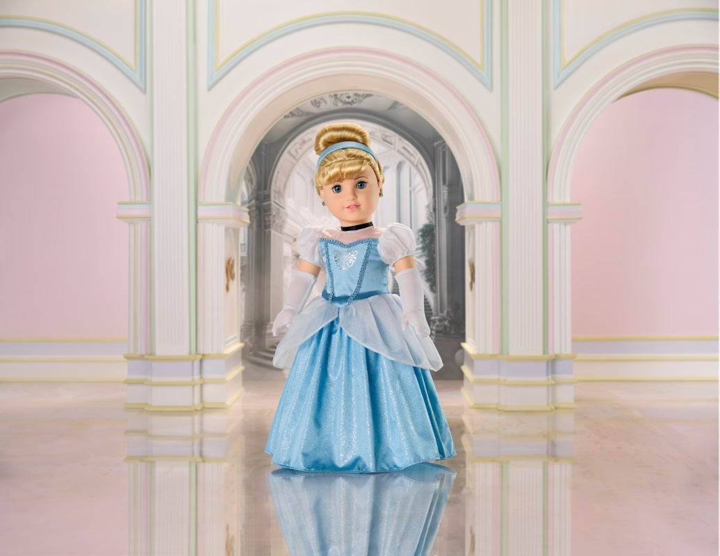 - American Girl Disney Princess Cinderella Doll has blue eyes and blonde hair styled in a high bun with blue headband and curled, sideswept bangs and arrives wearing her iconic blue ballgown and glittery “glass slippers."