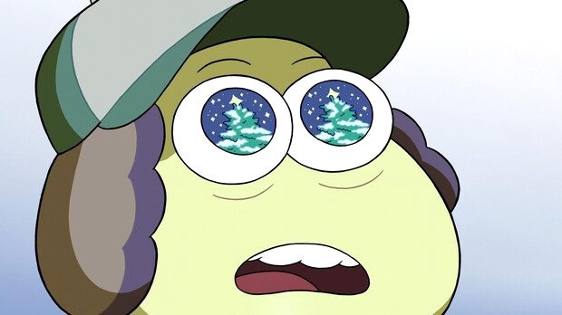 Out in the forest, Bill and Cricket are still searching for their tree, following a series of clues - or interpretations of the clues. Example: In Cricket’s dream, there were frozen fish sticks. That must mean they must have to go to this frozen pond where they have fished, and sure enough, not only are there fish frozen in the pond, there are frozen sticks as well. Frozen fish sticks! The next clues, including two snowballs and a sledding adventure, come to fruition after a series of events turns Bill and Cricket into rolling heaps of snow, blasting through a fence and inadvertently creating the parts needed to build a sled. All that’s left are the sweet sounds of Christmas Horns. Through the bushes, they spot some on a moose. Well, technically they are antlers but I guess we’re goin’ with it.