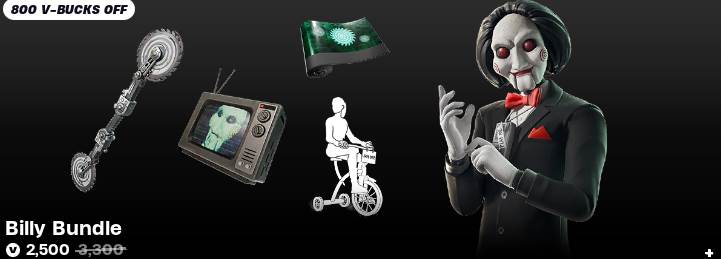 - For 2,500 V-Bucks (Around $22.50), players can pick up the Billy Bundle, which includes the Billy skin, Trap Television Back Bling, Spiralized Slicer Pickaxe, Billy’s Tricycle emote, and Puppet’s Choice wrap.
