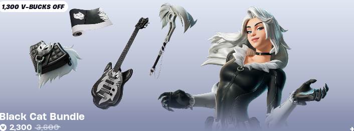 - Players can pick up the Black Cat Bundle. At a price of 2300 V-Bucks (Around $21), players will add the Black Cat Skin, Cat’s Pack backbling, Bad Luck Claws pickaxe, Cat’s Track weapon wrap, and The Black Cat Fortnite Festival guitar to their locker. Purchasing the bundle saves players 1300 V-Bucks (Around $13).