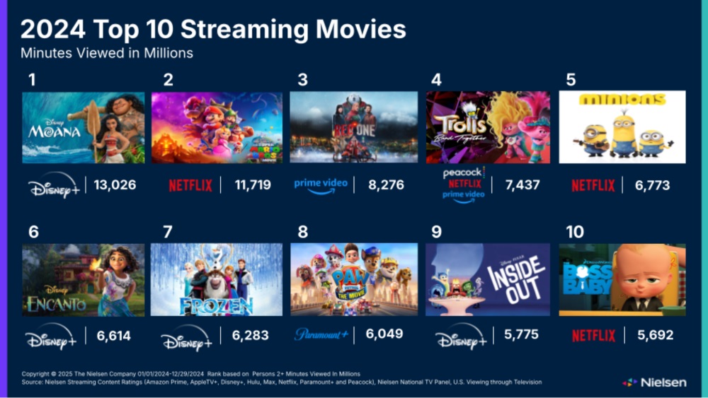 - Nine of the top ten most streamed films are animated, with Walt Disney Animation Studios’ 2016 hit, Moana nabbing the top spot once again, with 13.03 billion minutes viewed. Encanto, Frozen, and Pixar’s Inside Out, also appear on the last in the #6, 7. And 9 spots, respectively.