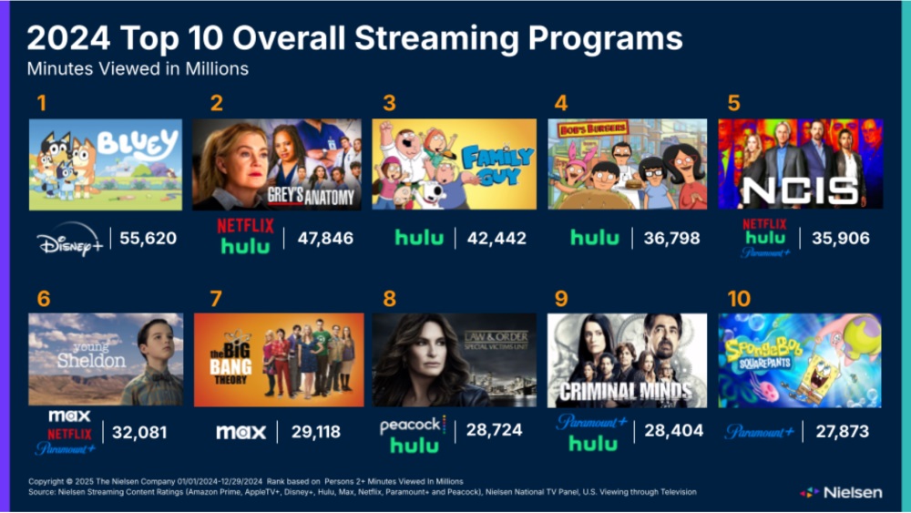 - According to a year-end Nielsen report, Bluey and Grey’s Anatomy were the most streamed programs of 2024.