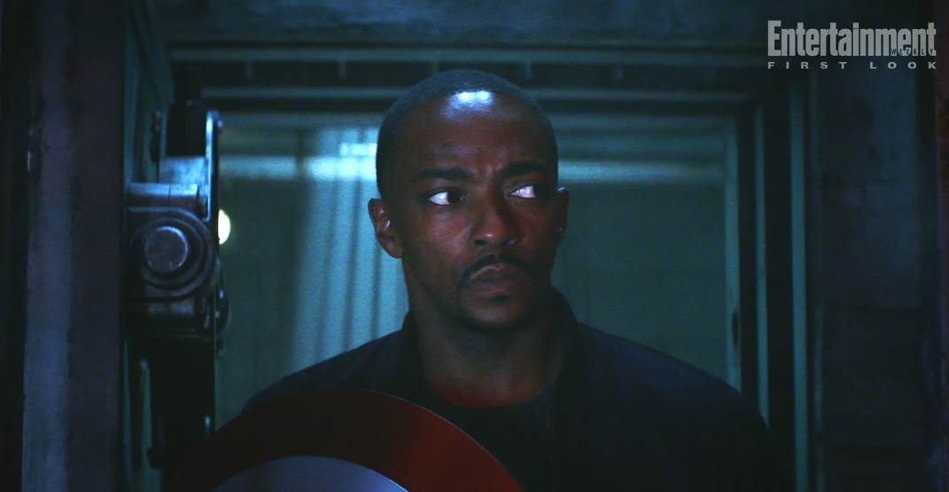 - The first of the two images features Sam Wilson (played again by Anthony Mackie) carrying his iconic Captain America shield.
