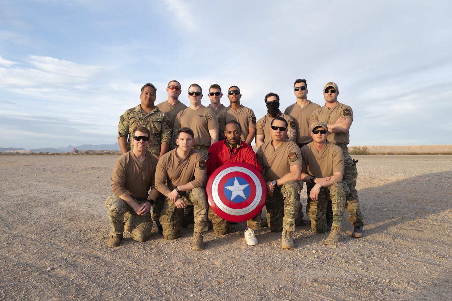 Anthony Mackie and other stars and creatives behind Captain America: Brave New World paid a visit to Nellis Air Force Base in Nevada on Monday to celebrate the film in a high-flying manner.
