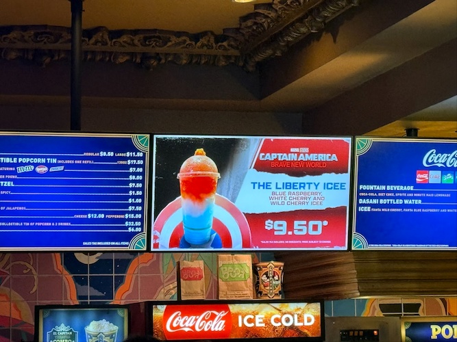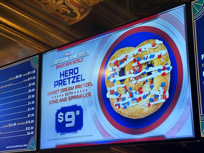 Over at the concession stand, a number of specialty treats and novelty items were available for purchase. Starting with refreshments, there’s a Hero Pretzel with icing and sprinkles for $9 as well as dueling drinks: Red Gamma Kick (Sprite with strawberry syrup, Tajin, and chamoy) for $8.50 and the Justice Punch (Sprite with Curaçao syrup) for $8. A Liberty Icee is also on the menu for $9.50.