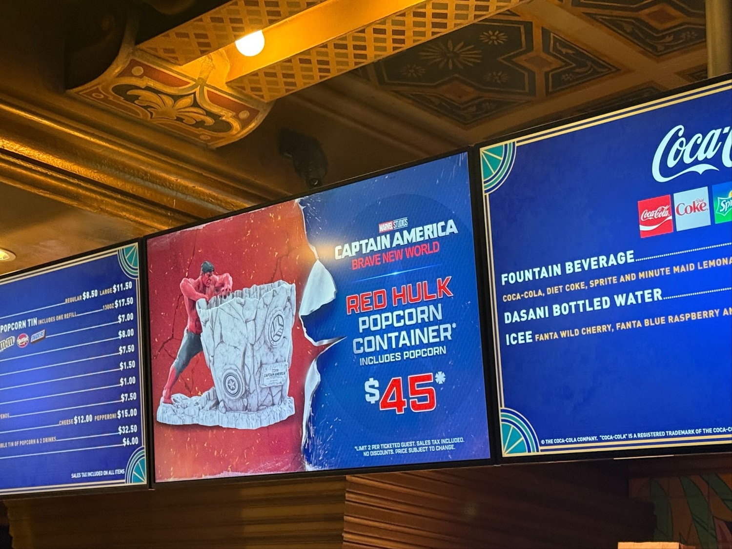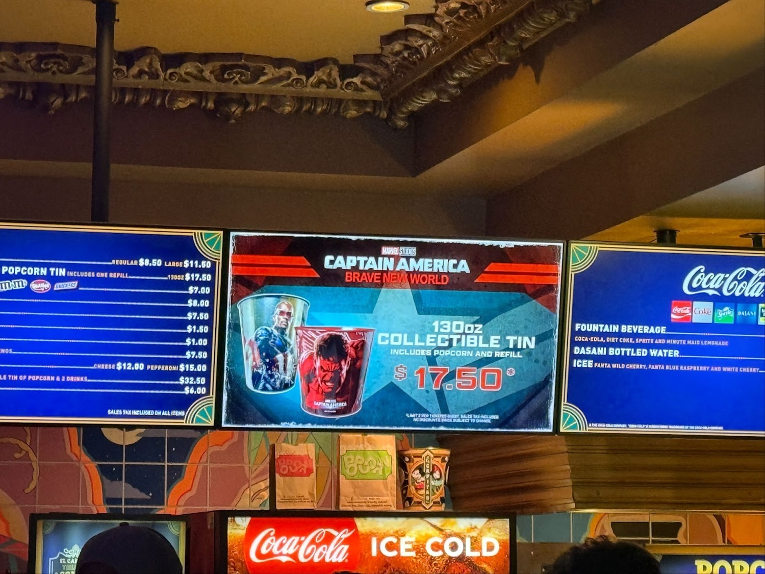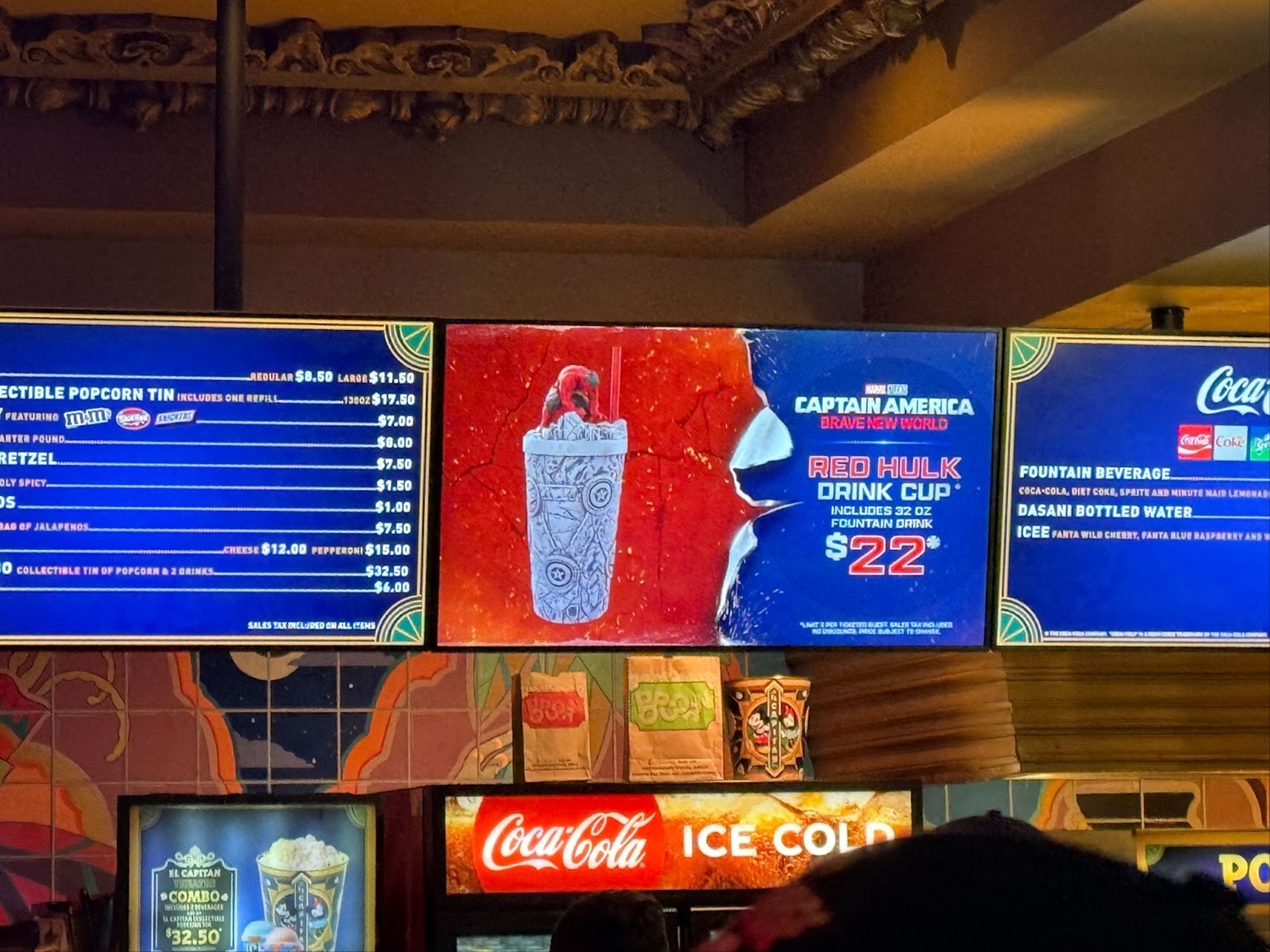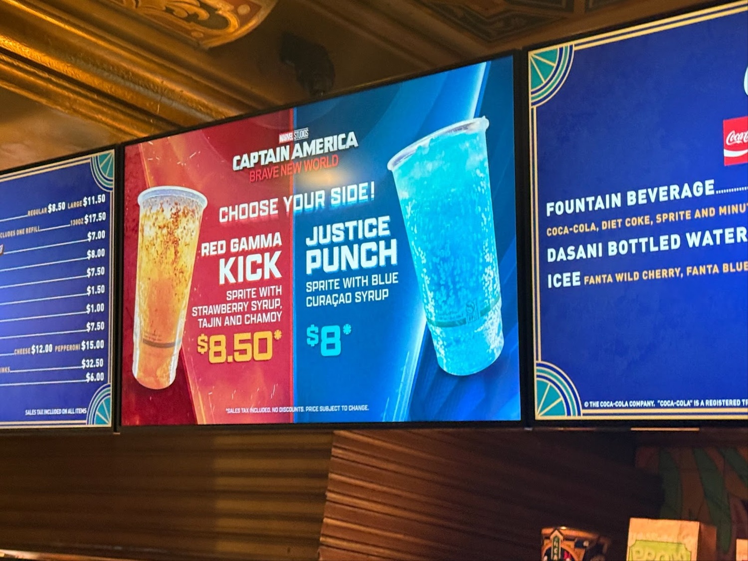 Over at the concession stand, a number of specialty treats and novelty items were available for purchase. Starting with refreshments, there’s a Hero Pretzel with icing and sprinkles for $9 as well as dueling drinks: Red Gamma Kick (Sprite with strawberry syrup, Tajin, and chamoy) for $8.50 and the Justice Punch (Sprite with Curaçao syrup) for $8. A Liberty Icee is also on the menu for $9.50.