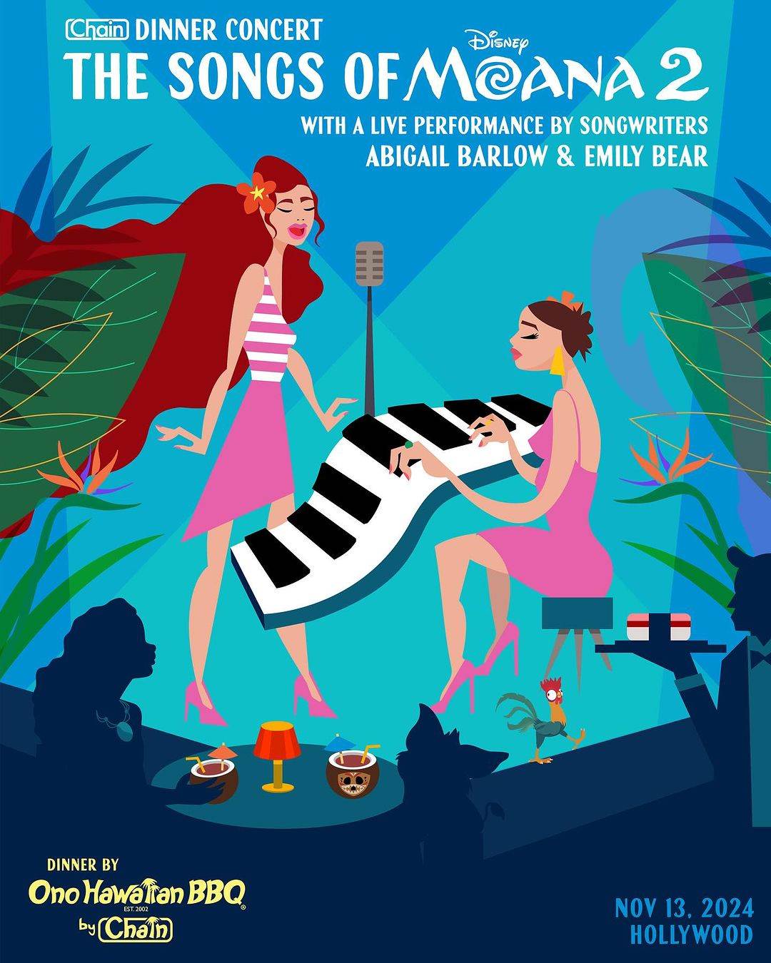 - Parties of two will be able to attend the event, which features the Motunui Musubi Meal, island-inspired cocktails, and musical performances by Abigail Barlow and Emily Bear, the songwriters of Moana 2’s soundtrack.