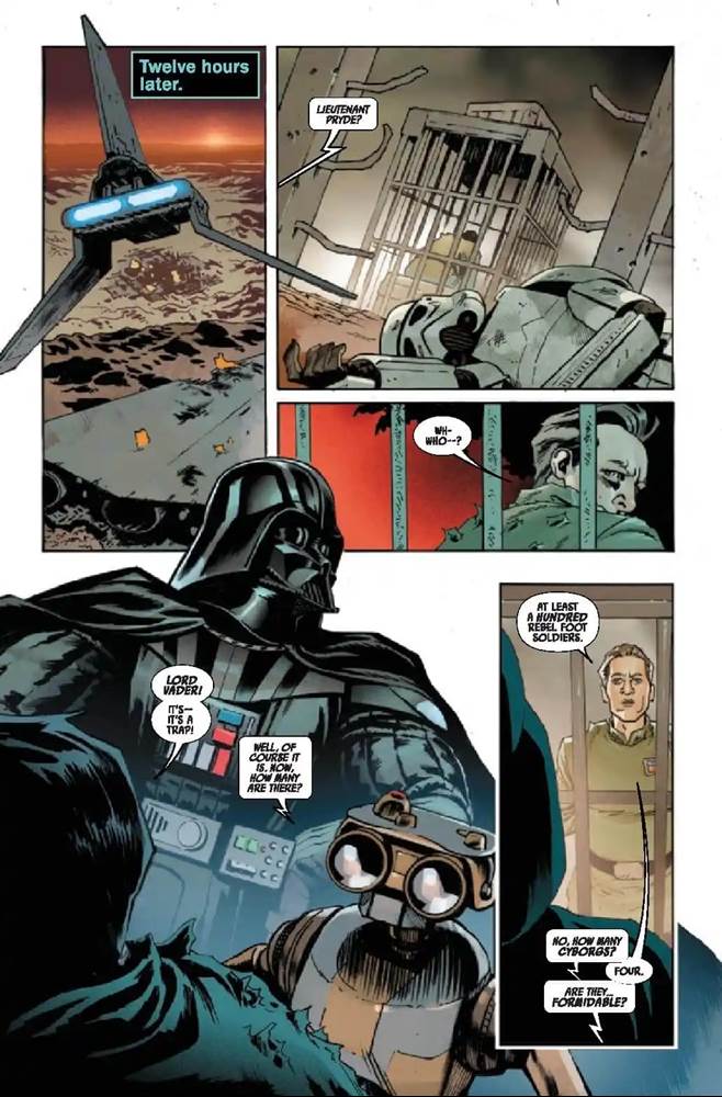 Regardless, writer Greg Pak then cuts to the droid-run settlement Zee-Nine City Seven (first seen in these pages way back in issue #13) where our old– young?-- friend Enric Pryde (actor Richard E. Grant’s character from Star Wars: The Rise of Skywalker) makes his very first chronological appearance in the canon. It seems then-Lieutenant Pryde is having trouble maintaining control of the Empire’s hold on this sector due to a lack of resources and troops, and this problem is exacerbated by the arrival of the so-called M.A.R. (Machine-Augmented Rebels) Corps of Alliance soldiers. But fortunately for Pryde, Darth Vader has a vested interest in collecting as many skilled cyborgs as he can, so he shows up, frees Enric from captivity, and sets about corrupting the M.A.R. troopers to his own designs.